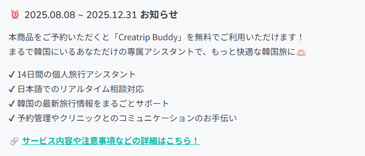 さらに、ソウルや釜山の対象クリニックを予約すると、「韓国旅行アシスト(Creatrip Buddy)」サービスを14日間無料でご利用いただけます。
