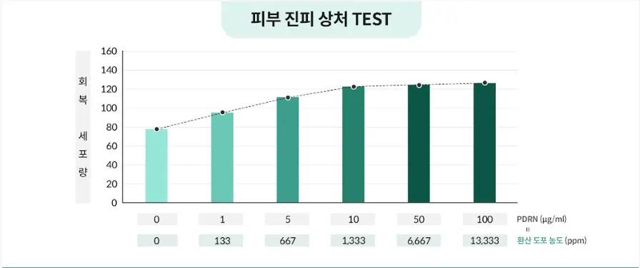 PDRNは濃度が高いほど細胞の回復速度が向上しますが、皮膚の真皮·表皮で行われた創傷治癒試験では1,300ppm以上で追加の効果は見られない という結果が出ています。つまり「濃度の高さが効果に比例する」というわけではないということです。