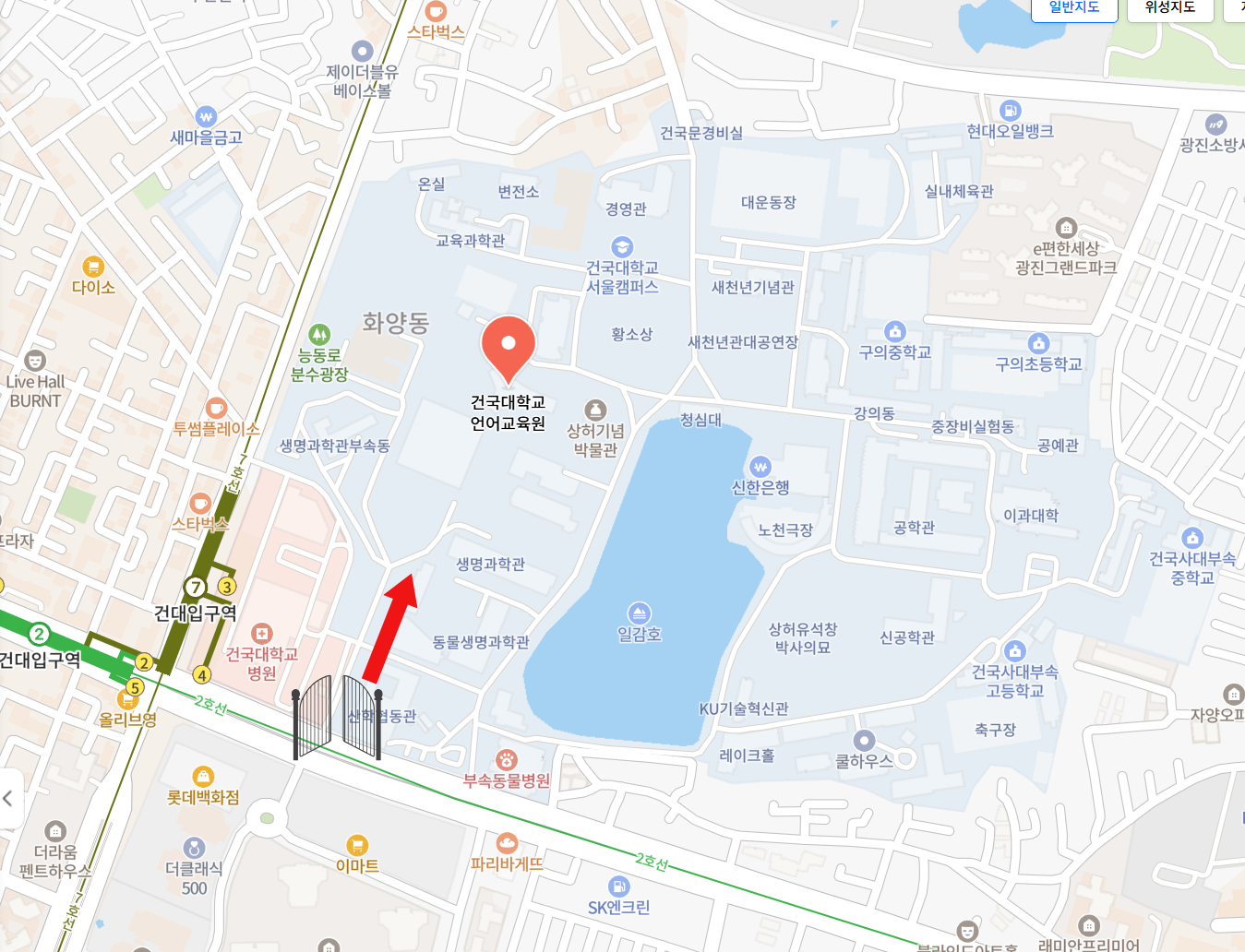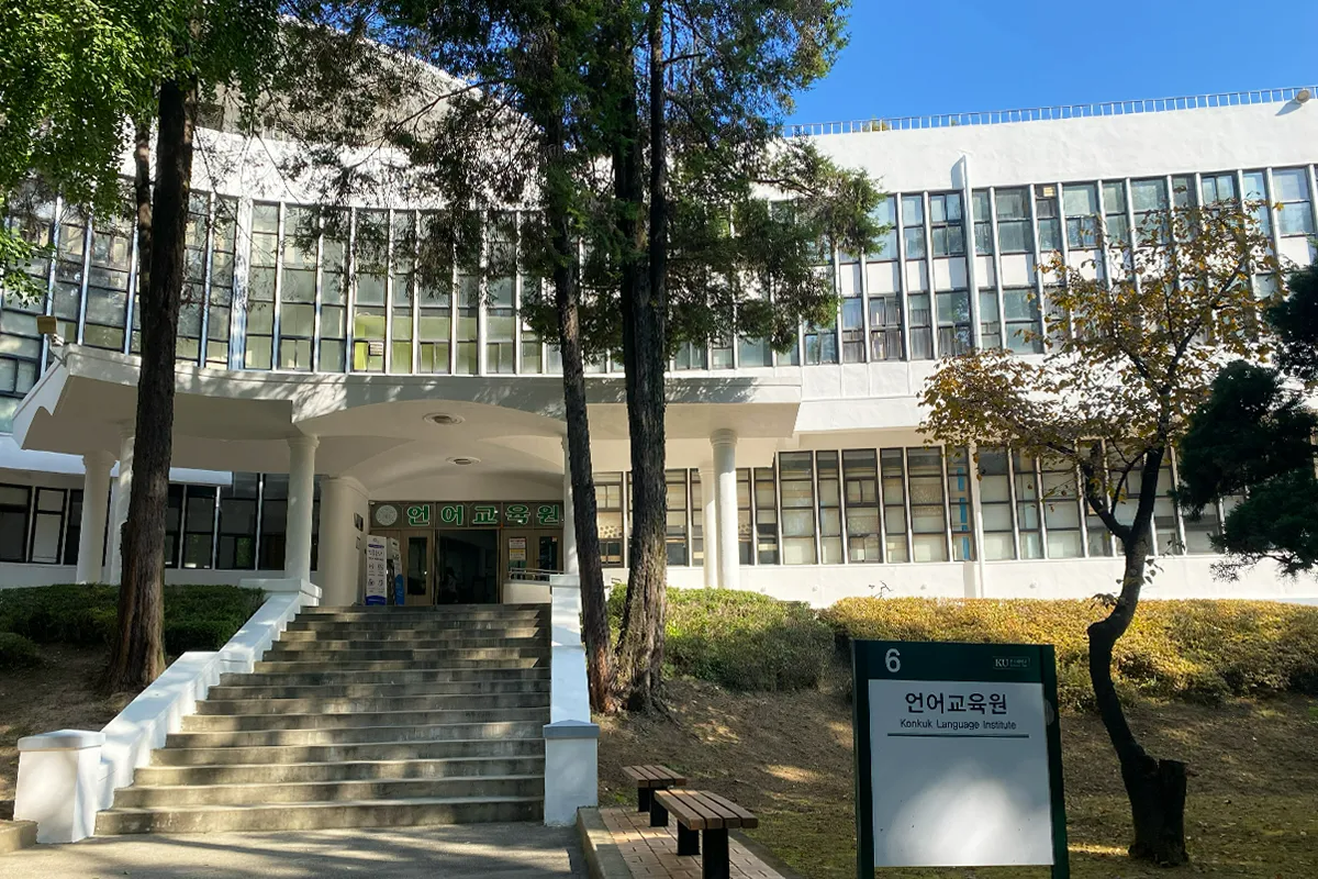 建国大学の語学堂の建物は、正門から直進した場所に位置している建物「언어교육원(言語教育院)」です