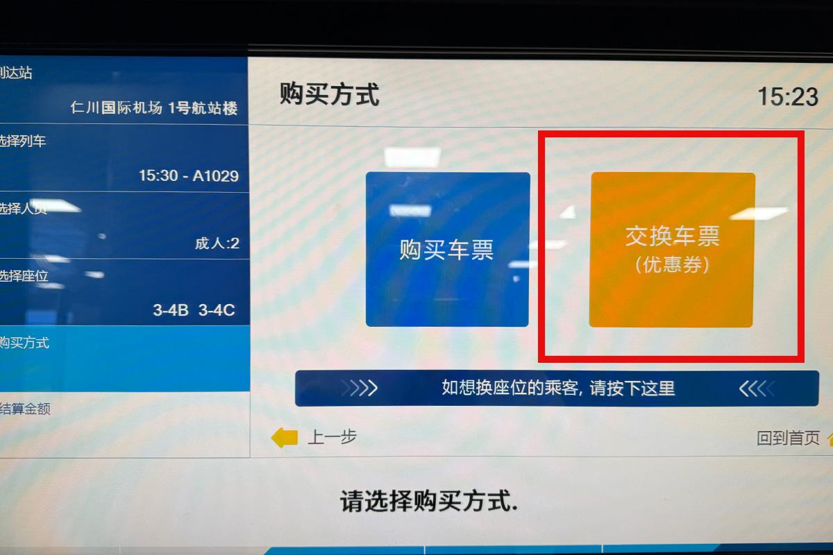 画面でオレンジ色で表示されている「交換乗車券」ボタンを探して押してください。