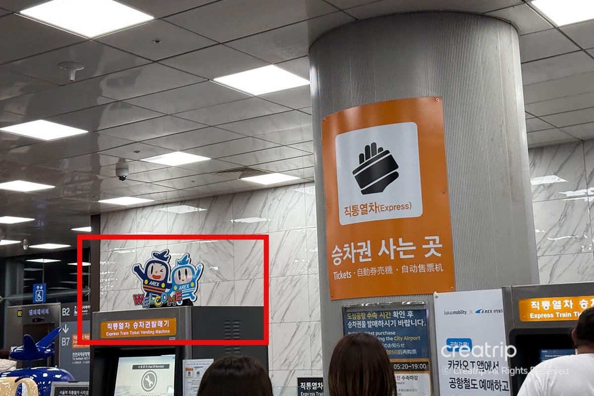 同様に、空港鉄道(直通)の案内表示に従って進むと、道なりにオレンジ色の券売機がすぐに見つかります。