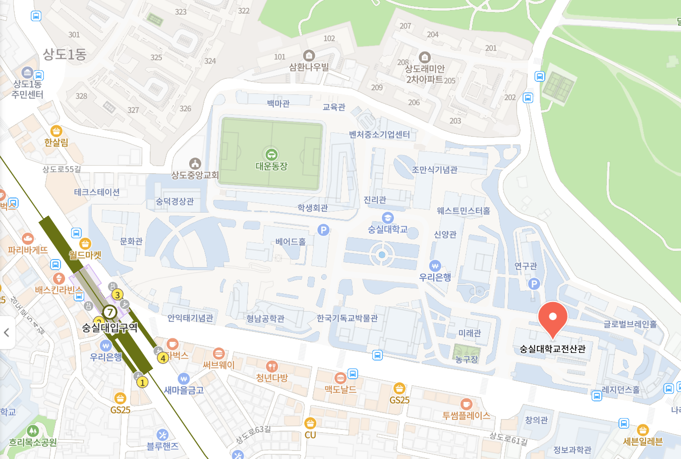 崇実(スンシル)大学は、7号線「崇実(スンシル)大入り口駅」すぐ側にあります。