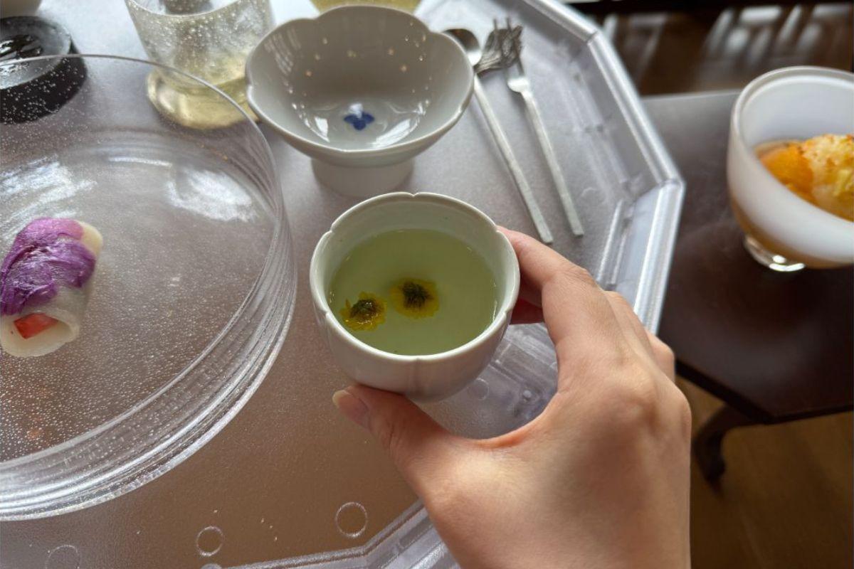 シグネチャーティーは、竹の葉、柚子、キンモクセイをブレンドしたお茶。