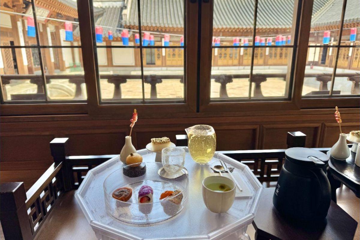 写真を綺麗に撮りたい方は、できれば窓側の席がおすすめ。庭園の景色が入るので、茶菓子セットの写真もより韓国らしい雰囲気になります。ただし席数には限りがあるため、必ず希望通りになるとは限らないので注意!