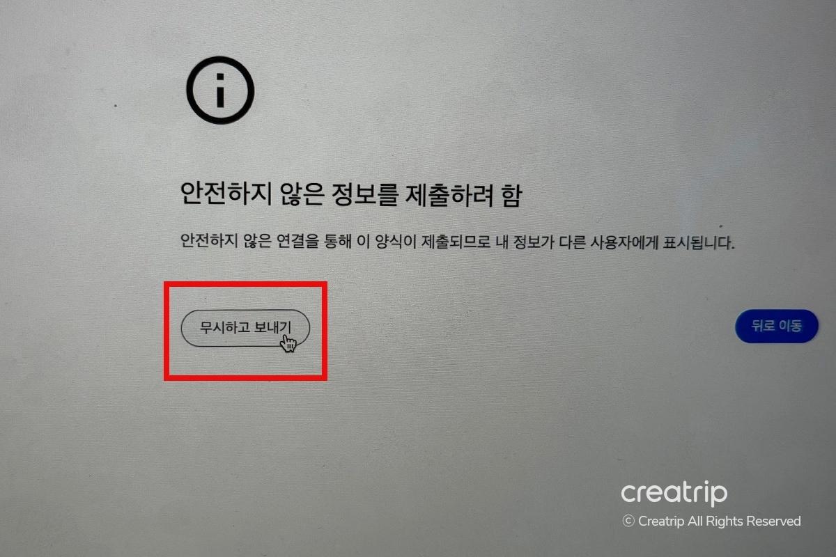 セキュリティ警告が表示された場合は、左側の「무시하고 보내기」を押してください。