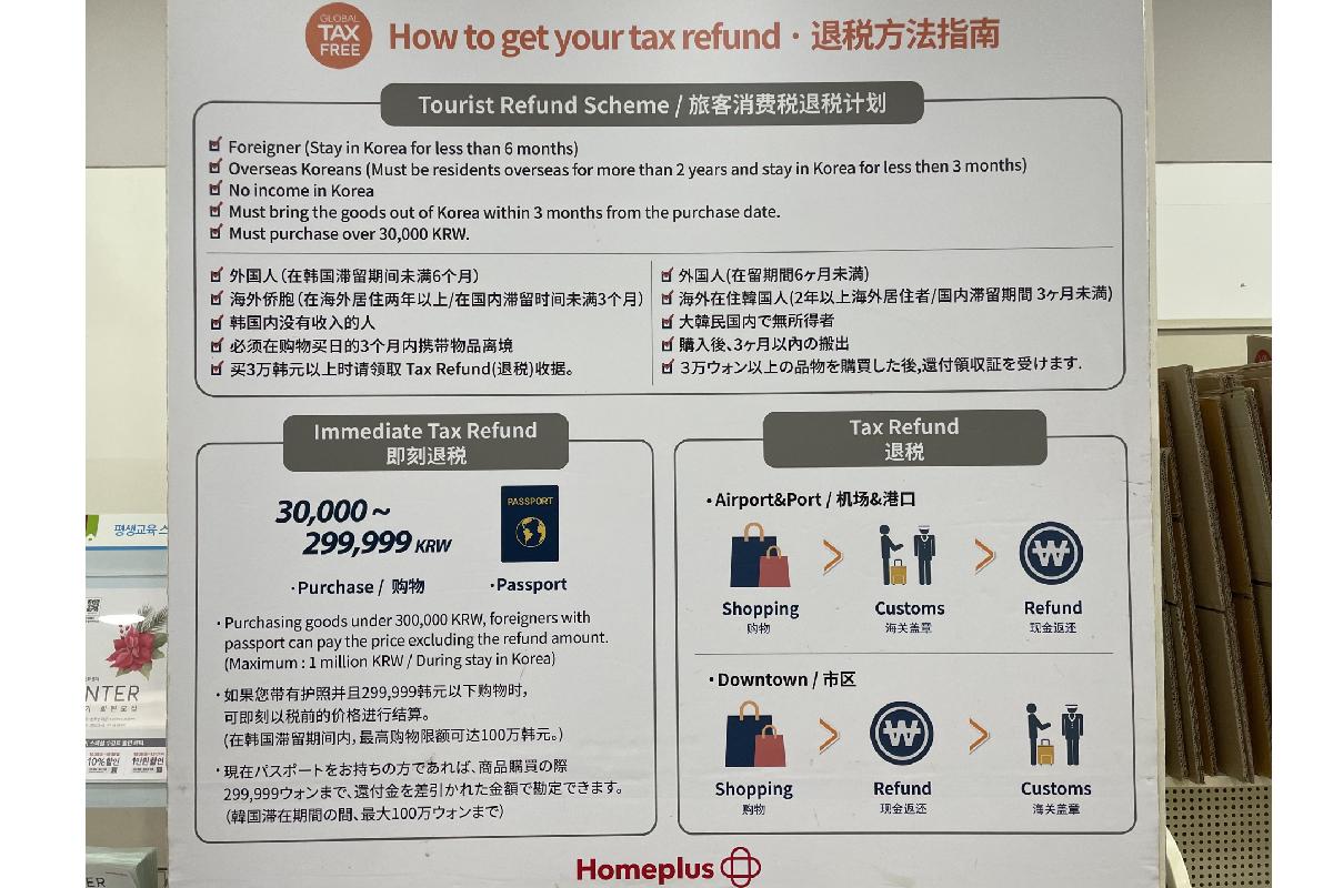 Homeplusでの免税手続き方法を案内する看板。韓国語、中国語、英語での情報提供。
