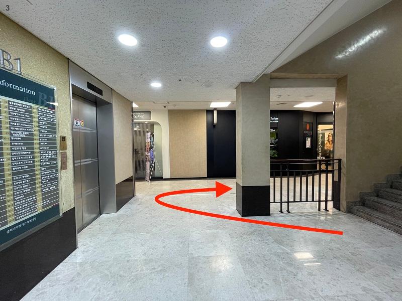 直進して突き当りを右に曲がり、地下1階に下ります。
