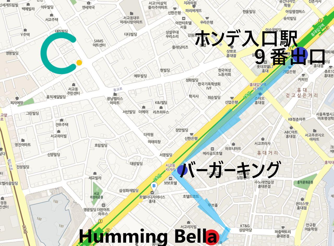 - 歩いていく方法:ホンデ入口駅9番出口から15分ほどまっすぐ進みます。または、ハプチョン駅3番出口から5分程直進しても行けます。