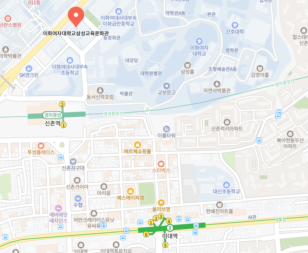 梨花女子大学・語学堂は、ソウル地下鉄2号線、梨大(イデ)駅、または京義(キョンイ)線 新村駅付近に位置しています。
