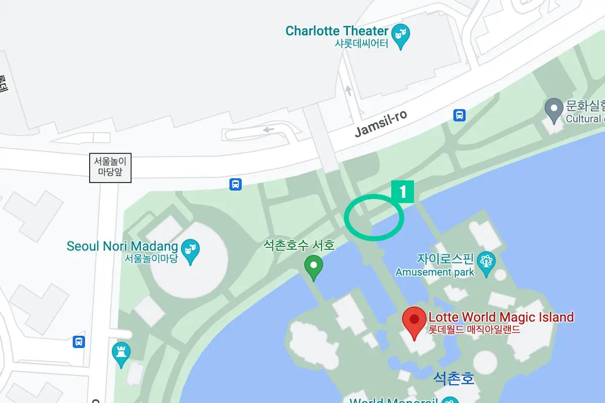 地図にはロッテワールド案内デスクと出ており、ロッテシアター前の階段の柱の上に座って撮ることができるスポットですが