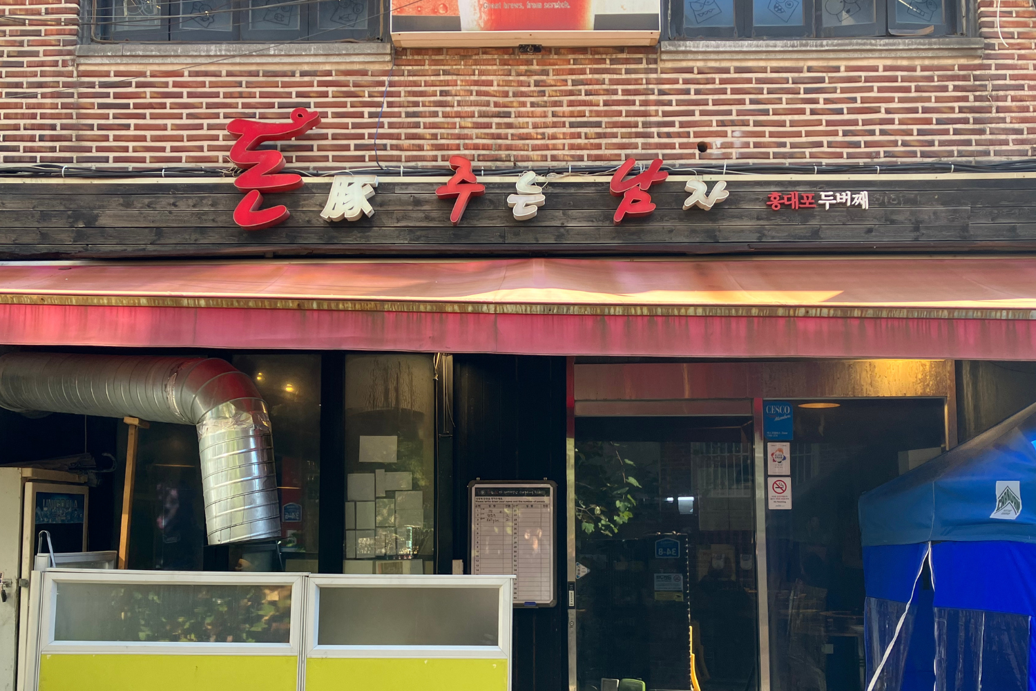 今SNSで品質の良い済州島産の豚肉が味わえると話題の弘大トンジュヌンナムジャ。路地に位置していて古そうな外観ですが、意外と広く老舗感漂う店内に味の期待が膨らみます