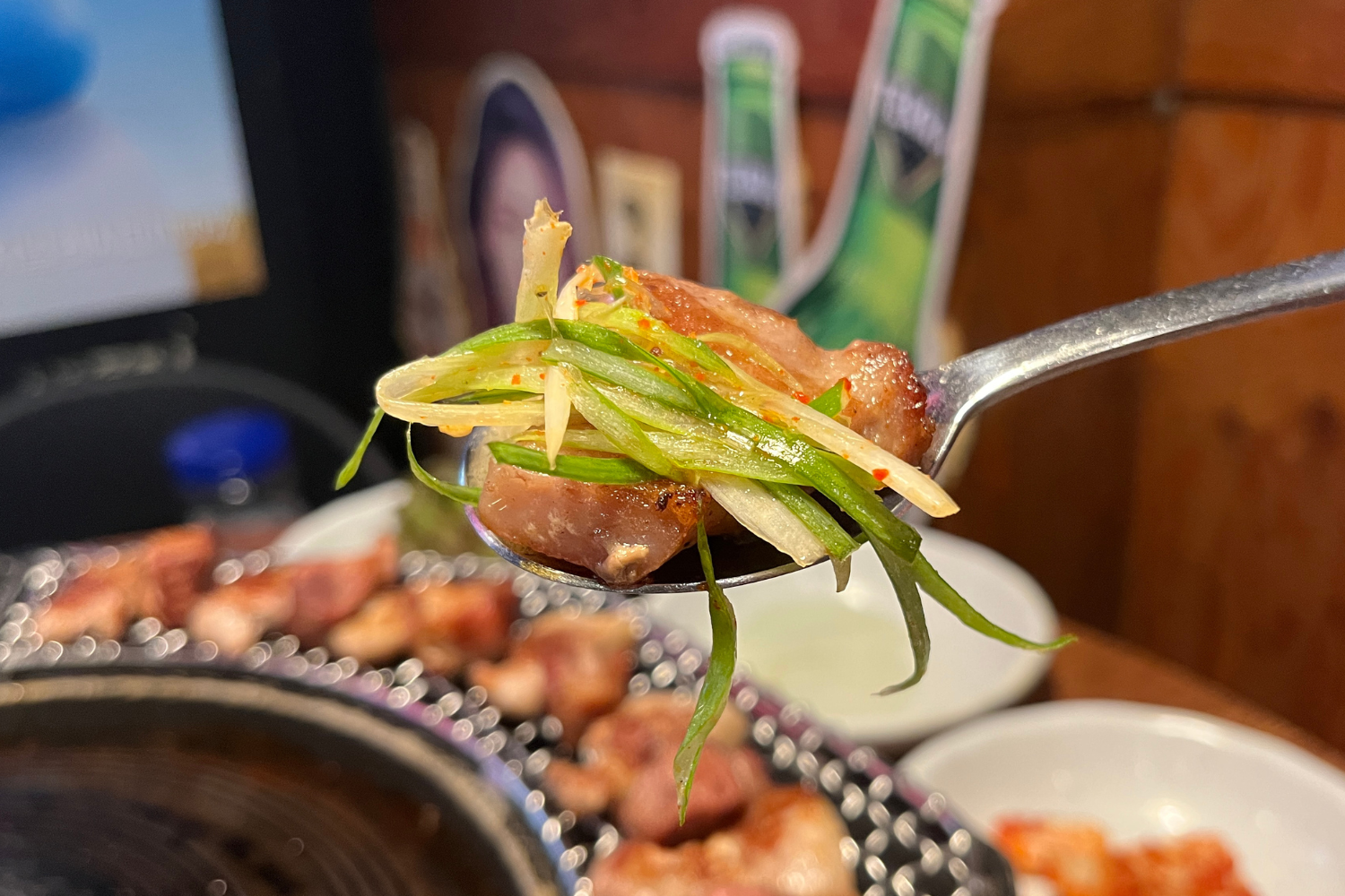お店特製の甘酸っぱい長ネギソースがジューシーに焼けたサムギョプサルの脂っこさを抑えてくれ相性抜群...。本当に絶品です。