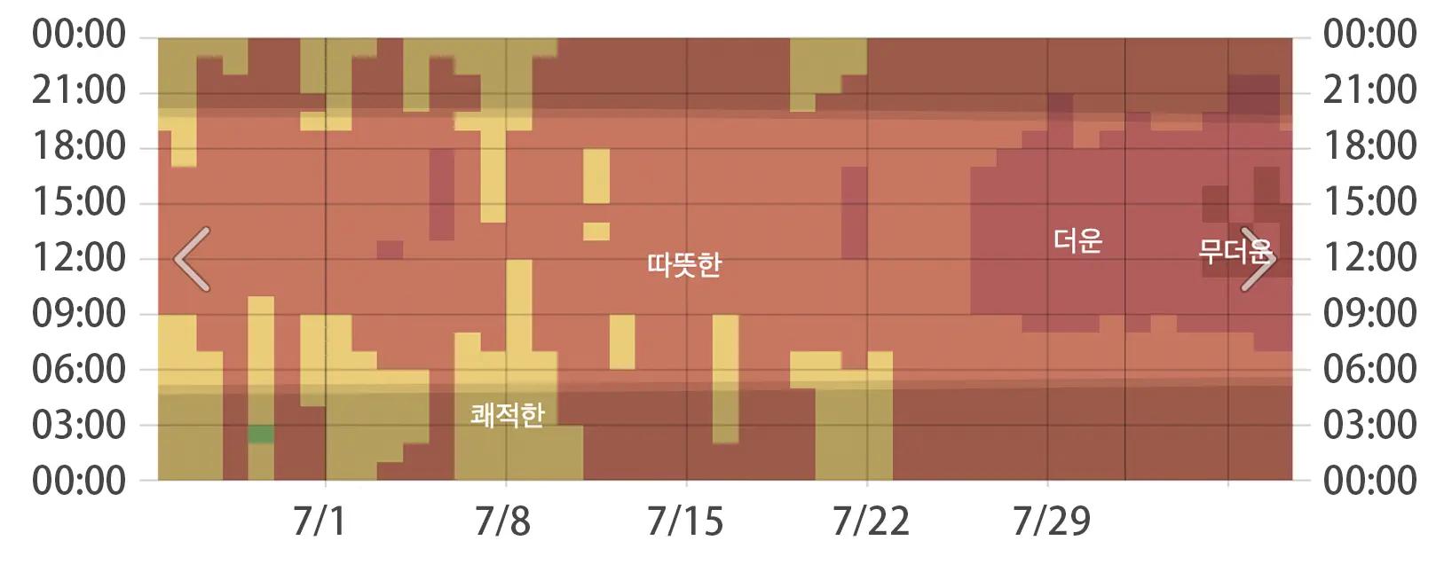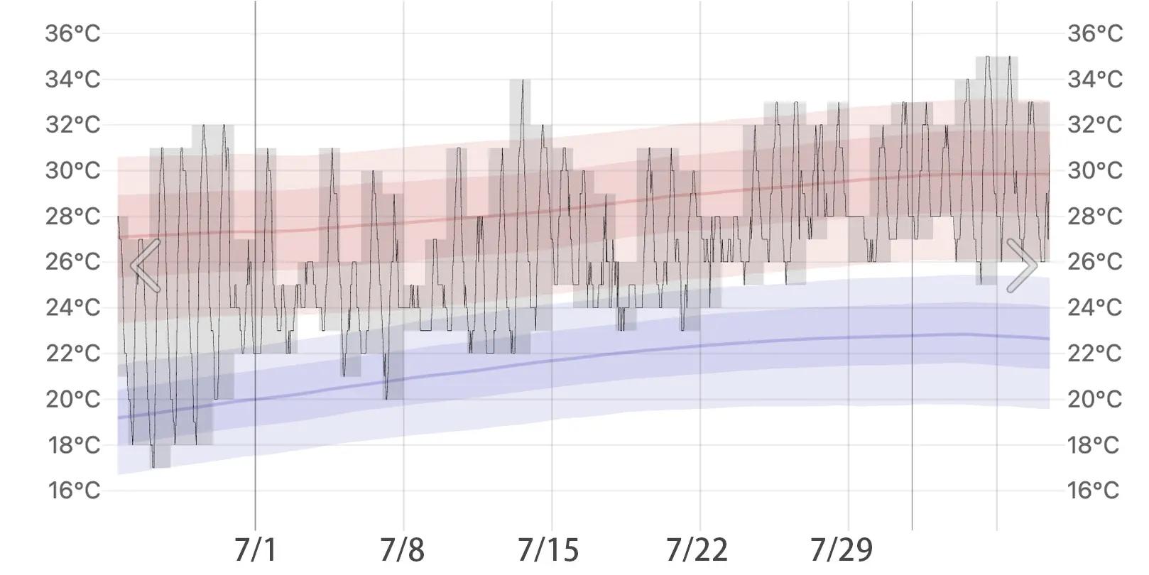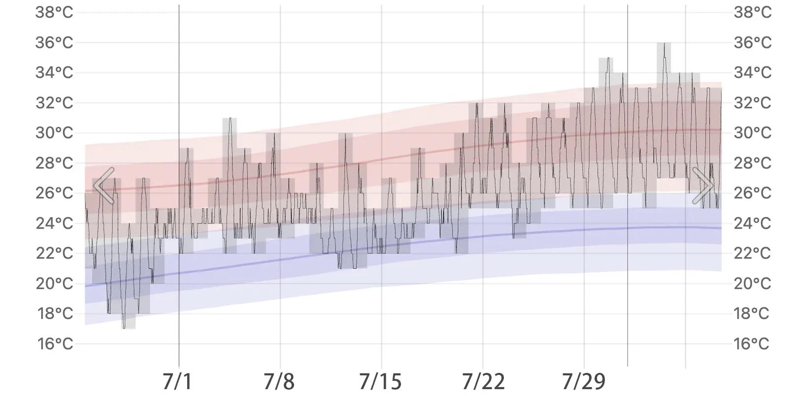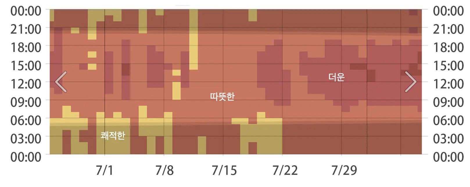 1日の気温の変化を見てみると、最も暑くなるのは朝9時から夕方6時頃(上図の濃い赤の部分)まで。それ以外の時間帯は、比較的過ごしやすい気温です。