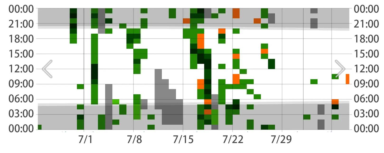 グラフ内の緑のエリアは、その時間帯に雨が降っていることを示しており、色が濃くなるほど雨が強いことを意味します。(黒に近い色は豪雨レベル)