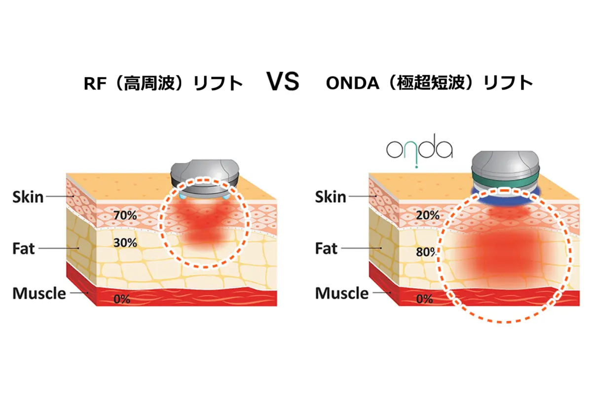 また、高周波リフトが広範囲に浅く作用し、超音波リフトが狭い範囲に深く作用するのに対し、オンダリフトは広い範囲に均一かつ深く熱エネルギーを届けられるのが特徴です。
