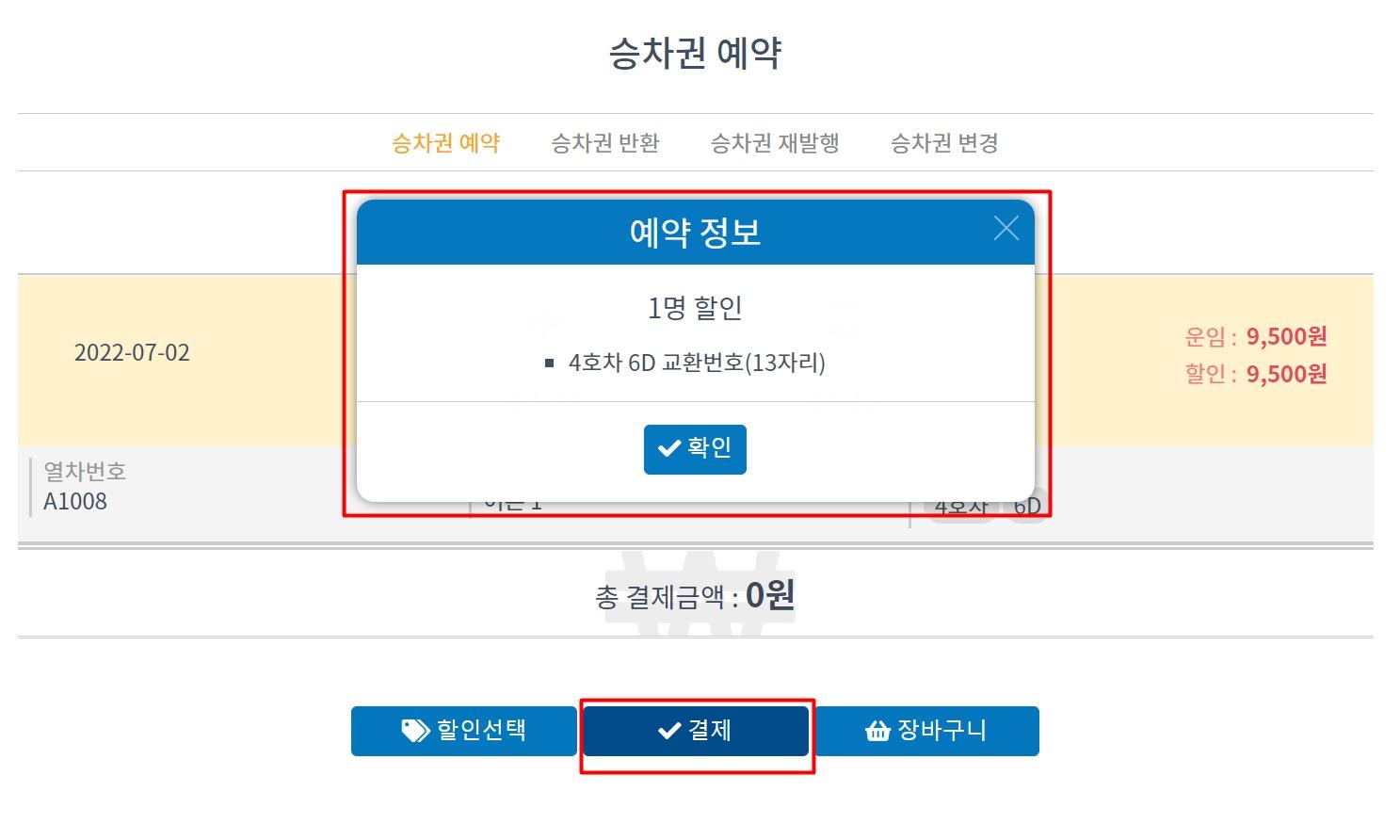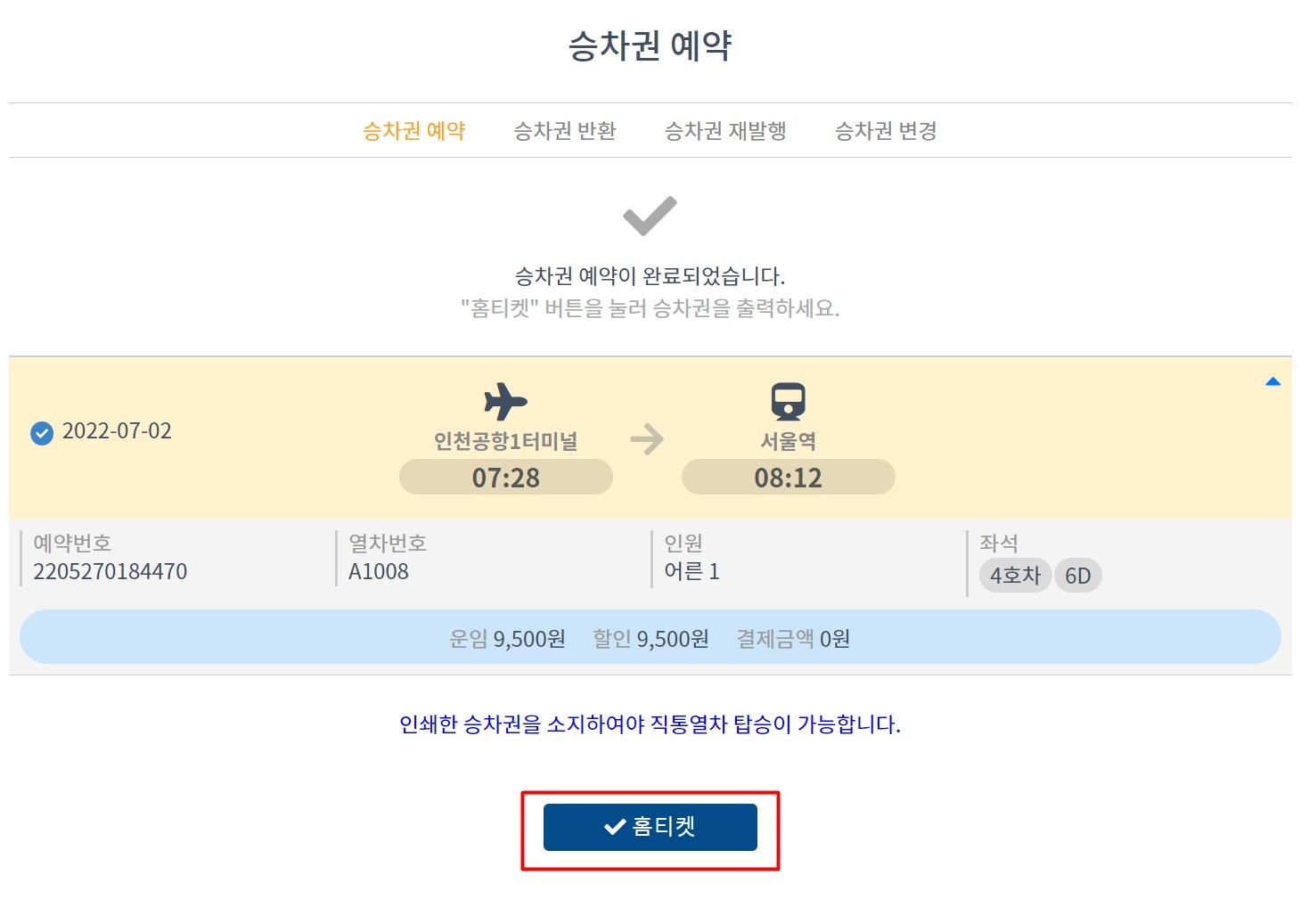 | Step 8 | 乗車券予約が完了しました! 下にある「홈티켓(ホームチケット)」を押してください。 ![]() |