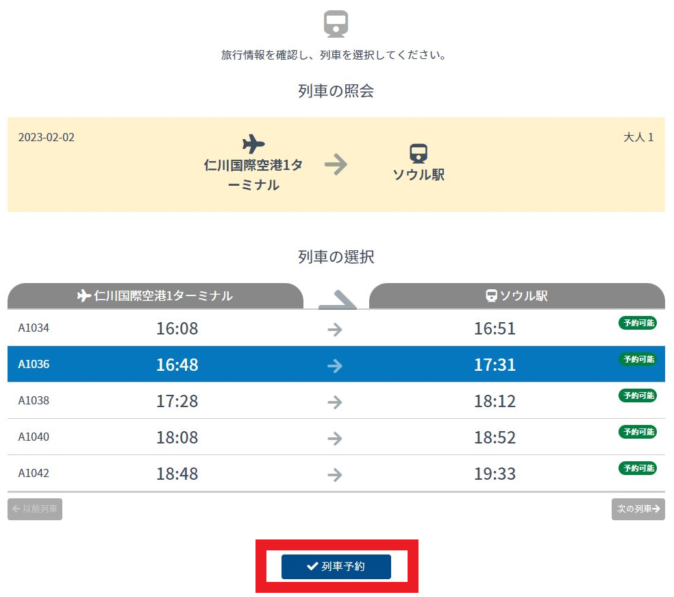 | Step 2 | 列車スケジュールを確認後、「列車予約」を押してください。 - 空き席がない場合は「売り切れ」と表示されます。 ![]() |