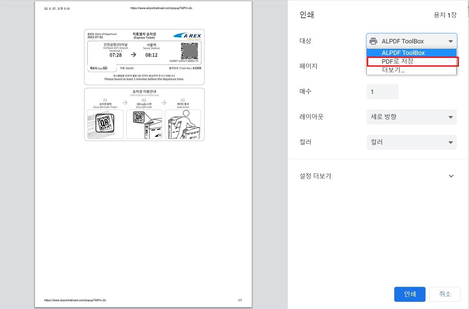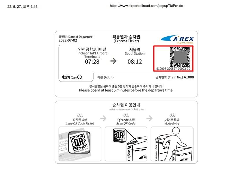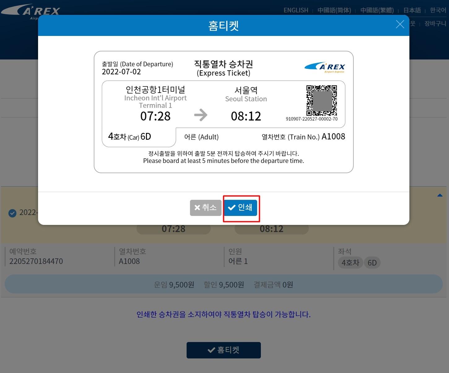 | Step 9 | 「홈티켓(ホームチケット)」にはQRコードが作成されるので列車ゲートにQRコードをスキャンすればすぐに入場が可能です。 印刷またはPDFファイルとして保存したい場合は、「인쇄(印刷)」ボタンを押してください。 ![]() |