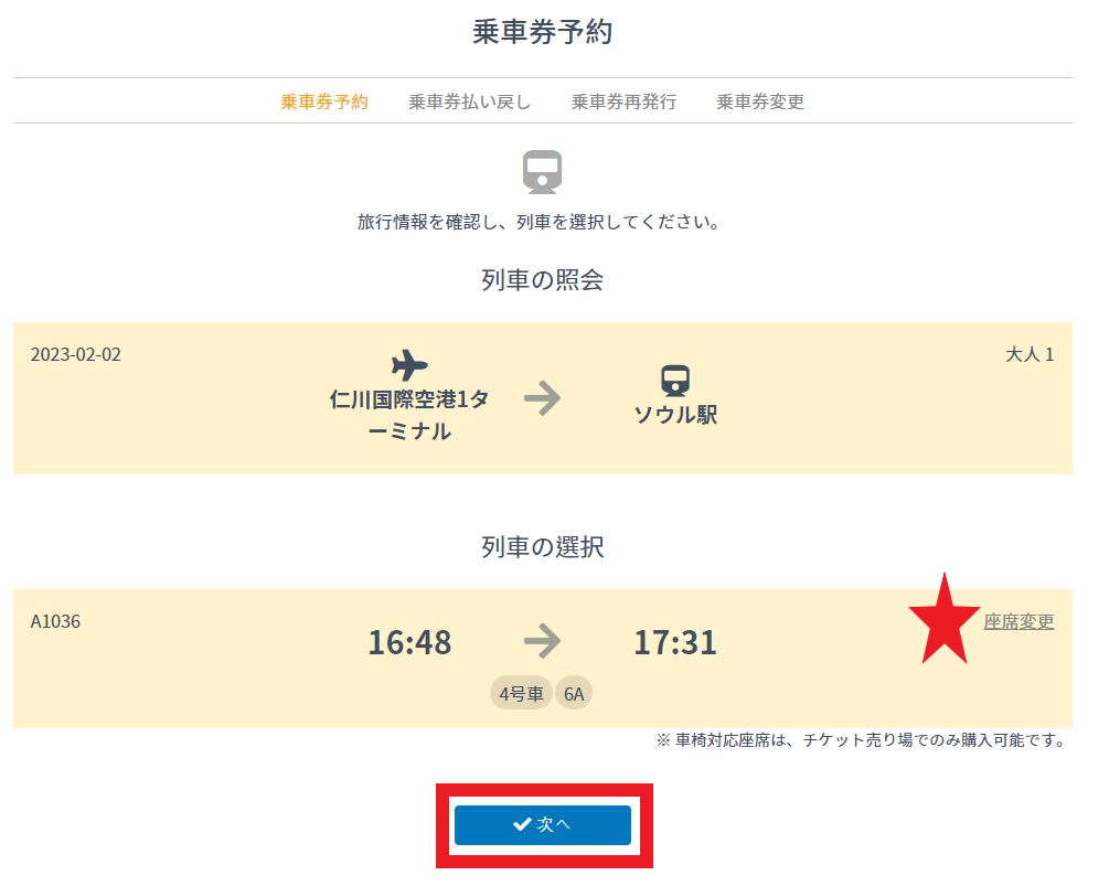 | Step 4 | - 列車のスケジュールを選択すると、自動的に座席が割り当てられます。 「次へ」を押してください。 - ご自身で座席を決めたい際には、★マークの「座席変更」ボタンをクリックして変更が可能です。 ![]() |