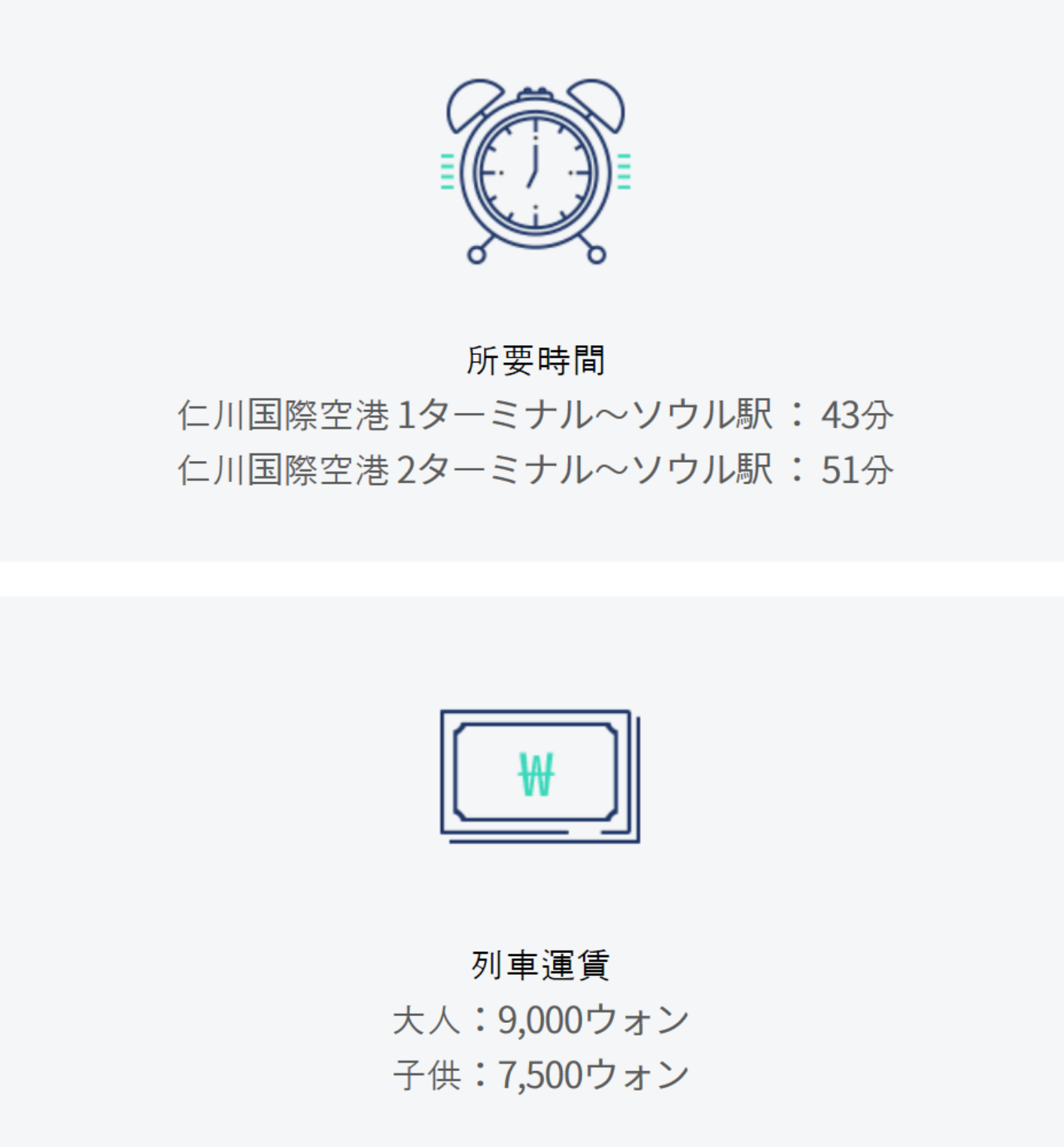 - ソウル駅から出発すると、乗車時間は1ターミナルまでは43分、2ターミナルまでは51分です。