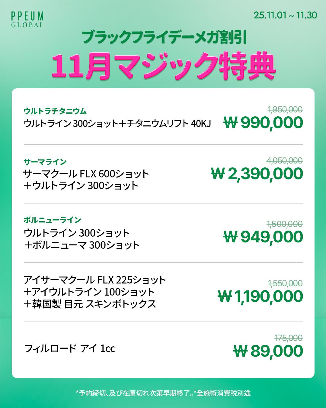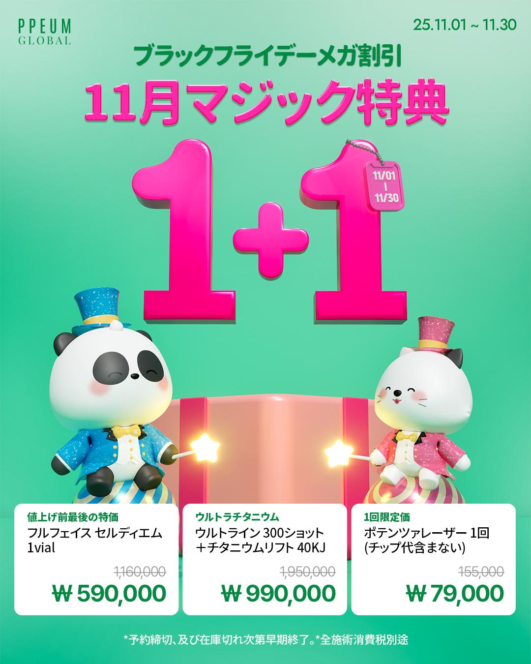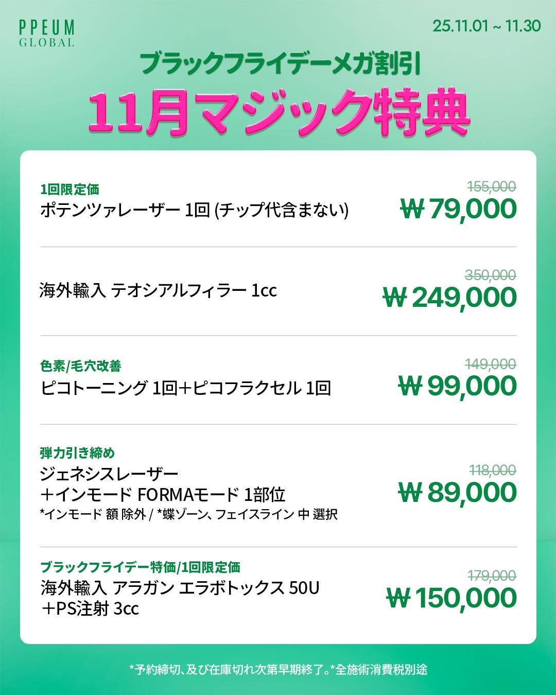 💚 おすすめポイント国際的な医療サービスでK-Beautyを先導韓国名門大学出身の医療陣による研究活動に基づいた高度な技術で最上の医療施術を提供弘大入口駅の9番出口より徒歩2分とアクセス便利ソウル旅行中に外国人旅行者も気軽に立ち寄れるロケーション日本語が話せるスタッフがいて安心!各言語に特化したオンラインサービスで海外からも簡単に予約問い合わせが可能外国語のパンフレットや荷物保管ができるラゲージゾーン、タックスリファンド(TAX REFUND)専用キオスクなど、外国人利用者を配慮したサービスVIPルームでプライベートに利用可Creatripでお得にプムクリニックの金券を購入!(ご予約はプムクリニックのオンラインサービスより直接お問い合わせ願います)│メニュー[特別価格] 2025.11.01~11.30