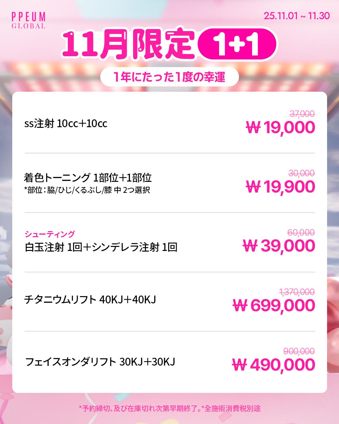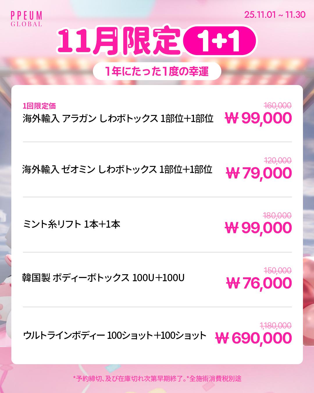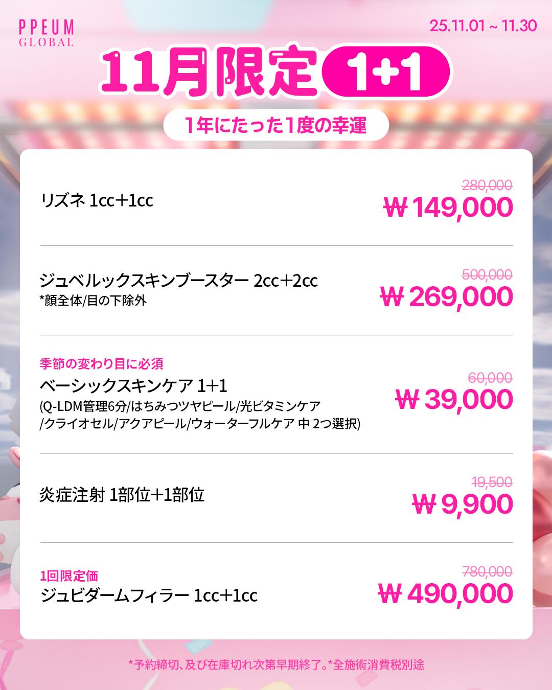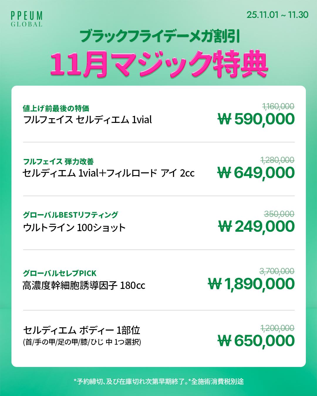 💚 おすすめポイント国際的な医療サービスでK-Beautyを先導韓国名門大学出身の医療陣による研究活動に基づいた高度な技術で最上の医療施術を提供弘大入口駅の9番出口より徒歩2分とアクセス便利ソウル旅行中に外国人旅行者も気軽に立ち寄れるロケーション日本語が話せるスタッフがいて安心!各言語に特化したオンラインサービスで海外からも簡単に予約問い合わせが可能外国語のパンフレットや荷物保管ができるラゲージゾーン、タックスリファンド(TAX REFUND)専用キオスクなど、外国人利用者を配慮したサービスVIPルームでプライベートに利用可Creatripでお得にプムクリニックの金券を購入!(ご予約はプムクリニックのオンラインサービスより直接お問い合わせ願います)│メニュー[特別価格] 2025.11.01~11.30