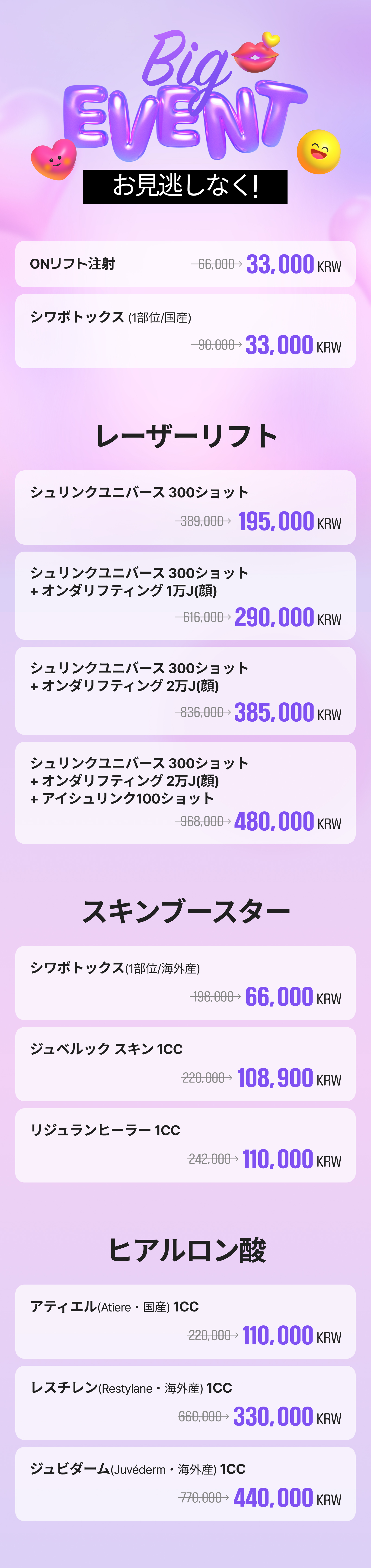 本商品をご予約いただくと「Creatrip Buddy」を無料でご利用いただけます!まるで韓国にいるあなただけの専属アシスタントで、もっと快適な韓国旅に💚✓ 14日間の個人旅行アシスタント✓ 日本語リアルタイム相談対応✓ 韓国の最新旅行情報をまるごとサポート✓ 予約管理やクリニックとのコミュニケーションのお手伝い🔗 サービス内容や注意事項などの詳細はこちら!