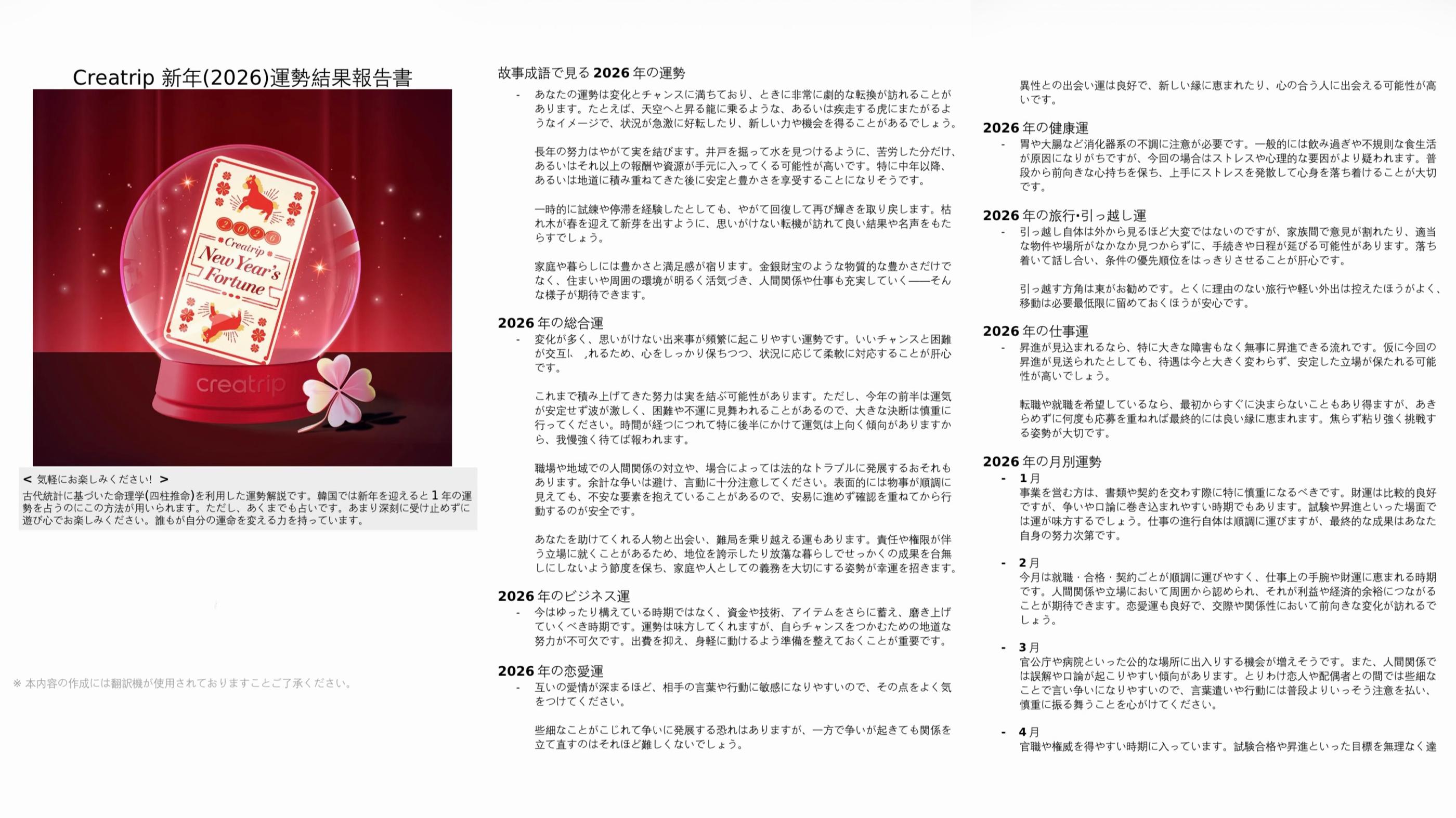 Creatrip独自の占いデータにもとづいた運勢レポートが48時間以内に届く
