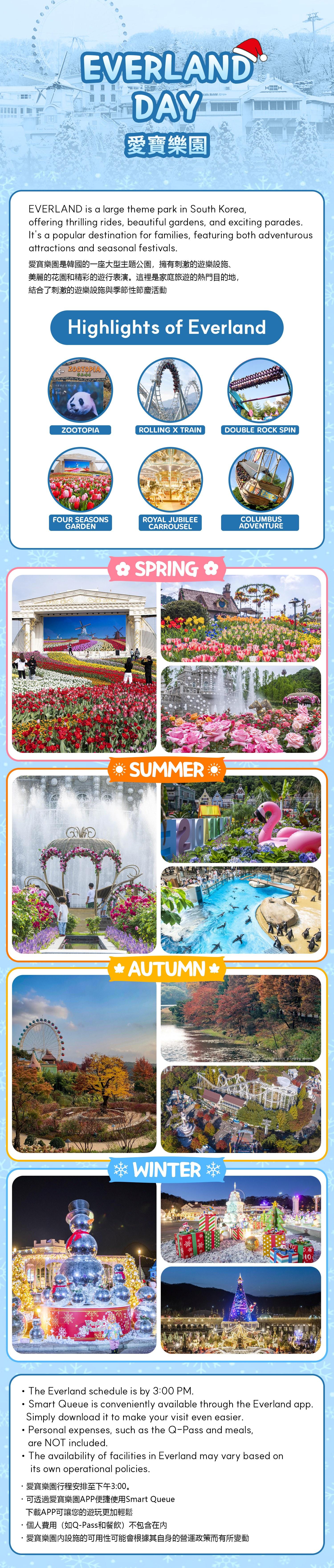エバーランドは韓国最大級のテーマパークです。スリル満点のアトラクションや美しいガーデン、楽しいパレードなど、見どころ満載のシーズンイベントを楽しめます。