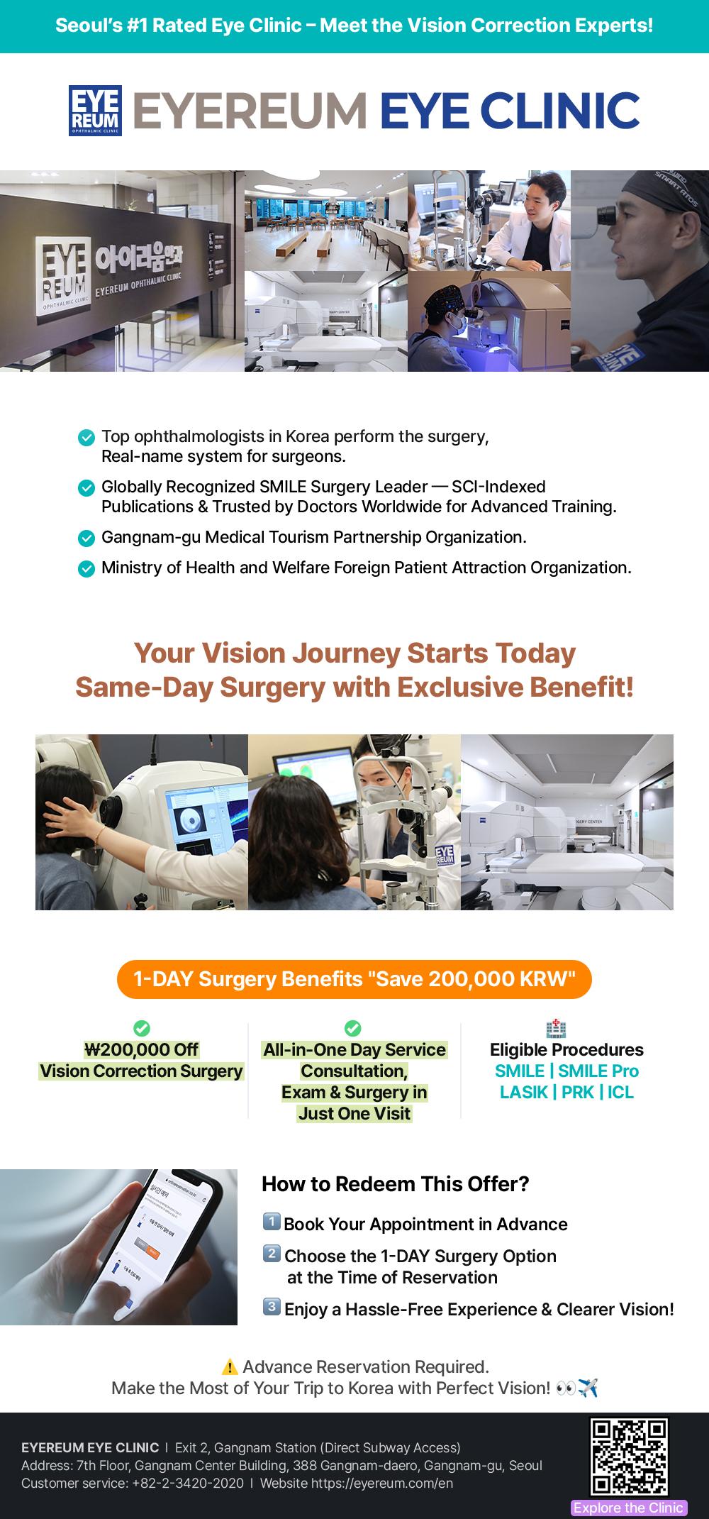 💚 おすすめポイント韓国初のSMILE Pro導入プレミアム視力矯正専門眼科江南駅直結のアクセス&世界的名医Dr.Kangが主導2011年の設立以降、60編以上のSCI論文と受賞歴SMILEだけでなくICL分野でも国内最多レベルの実績アジア各国の医療陣も視察に訪れる高い臨床ノウハウ世界最高水準の装備と独自のLow Energy SMILE技術老眼·白内障対応の中高年向けカスタム矯正プログラム日本語対応の専任コーディネーター付きで安心│詳細情報時間:月火木金 10:00~18:30 / 土 09:00~17:00 (昼休憩 12:30~14:00)予約可能時間:月火木金 10:00~11:00、14:00~15:00 / 土 10:00~11:00、14:00~14:30対応言語:韓国語、日本語、英語、中国語、モンゴル語さらに詳しい情報は下記リンクをチェック!EYEREUM EYE CLINIC の紹介EYEREUM EYE CLINIC ESCRS2024カンファレンス[イメージスライダー]1. SMILELow Energy SMILE (Oneday): ₩2,250,000 (2250000)角膜に2~4mmの小さな切開を入れて、フェムト秒レーザーでレンチキュール(角膜内の組織片)を取り除く非切開型の視力矯正手術です。痛みや乾燥感、光のにじみ(ハローグレア現象)を最小限に抑えられ、回復が早いのが特長です。Low Energy SMILE: ₩2,450,000 (2450000)基本のSMILE手術の長所はそのままに、レーザーのエネルギーを意図的に抑えることで、角膜へのダメージや視力の歪み(高次収差)をさらに軽減したバージョンです。回復が早く、角膜表面のなめらかさが向上する効果がSCIの学術誌にも報告されており、夜間のまぶしさや光のにじみの軽減にもつながる、EYEREUM EYE CLINIC独自の技術です。PresbyMAX SMILE: ₩4,500,000 (4500000)老眼矯正機能を追加し、近視·遠視ともに改善できるように設計された手術法です。2. SMILE PROLow Energy SMILE pro (Oneday): ₩4,000,000 (4000000)低エネルギーのレーザーで角膜へのダメージを抑え、回復を早める視力矯正手術です。一眼あたり約8秒という超高速フェムト秒レーザー照射により、従来のSMILE手術より短時間で精密に行え、最小限の切開で高い効果が得られます。Low Energy SMILE pro: ₩4,200,000 (4200000)PLASMA SMILE pro (Oneday): ₩4,900,000 (4900000)プラズマエネルギーを活用して高次収差をさらに抑え、夜間でもより鮮明な視界を実現する視力矯正手術です。PLASMA SMILE pro: ₩5,100,000 (5100000)PresbyMAX SMILE pro: ₩4,800,000 (4800000)老眼矯正機能を追加し、近視·遠視ともにクリアに見えるように視力を同時に改善する手術法です。3. LASEKAll Laser LASEK: ₩1,490,000 (1490000)角膜上皮の除去から残った角膜の補強までをすべてレーザーで行う視力矯正手術です。CustomEyes LASEK: ₩2,790,000 (2790000)患者一人ひとりの角膜の形に合わせてカスタマイズ設計を行い、夜間のまぶしさや光のにじみ(ハローグレア現象)をさらに抑えられる手術です。4. ICLEVO ICL PLUS : ₩5,200,000 (5200000)EVO TORIC ICL PLUS : ₩6,200,000 (6200000)個人の目に合わせた特殊レンズを虹彩と水晶体の間に挿入し、視力を矯正する手術です。FDA承認のStaar Surgical EVO+ 親水性レンズを使用し、角膜を傷つけずに高度な近視や乱視にも対応できます。視力の回復が早く、角膜が薄くてレーシックやラセック、SMILE手術が受けられない方にも安全に行えるのが特長です。