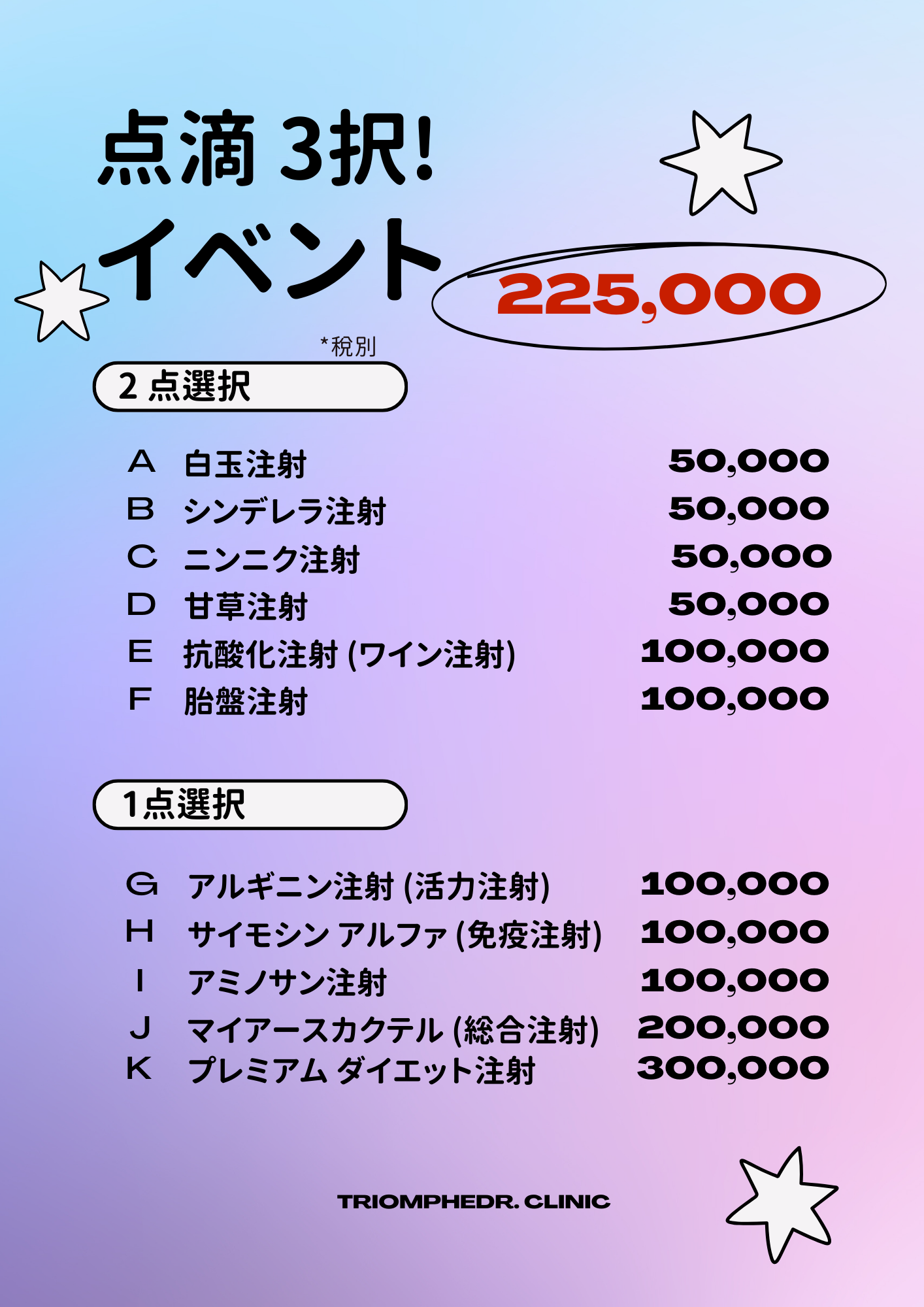 おすすめ対象 | 美白や抗酸化効果の点滴注射を希望する方 |