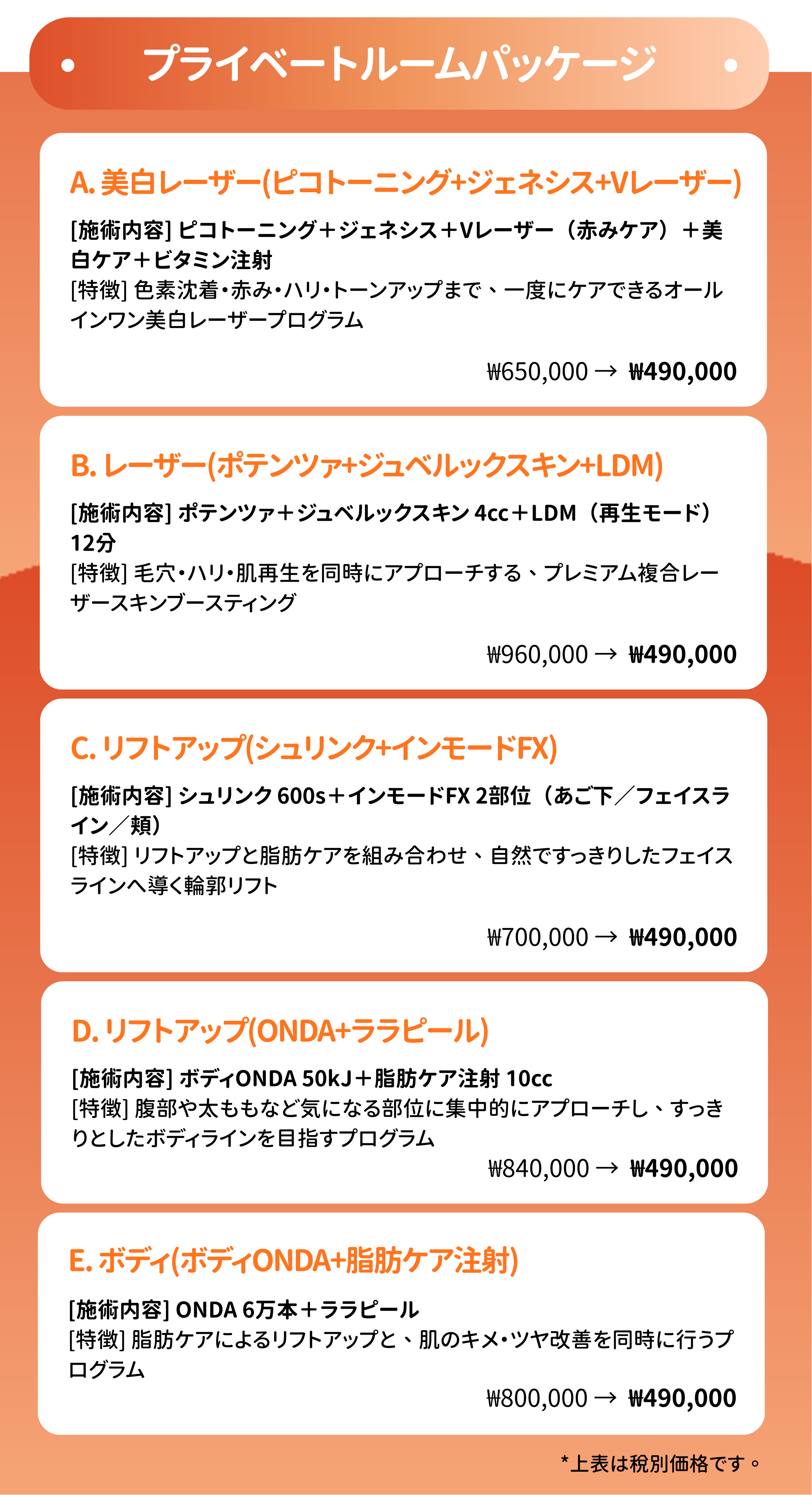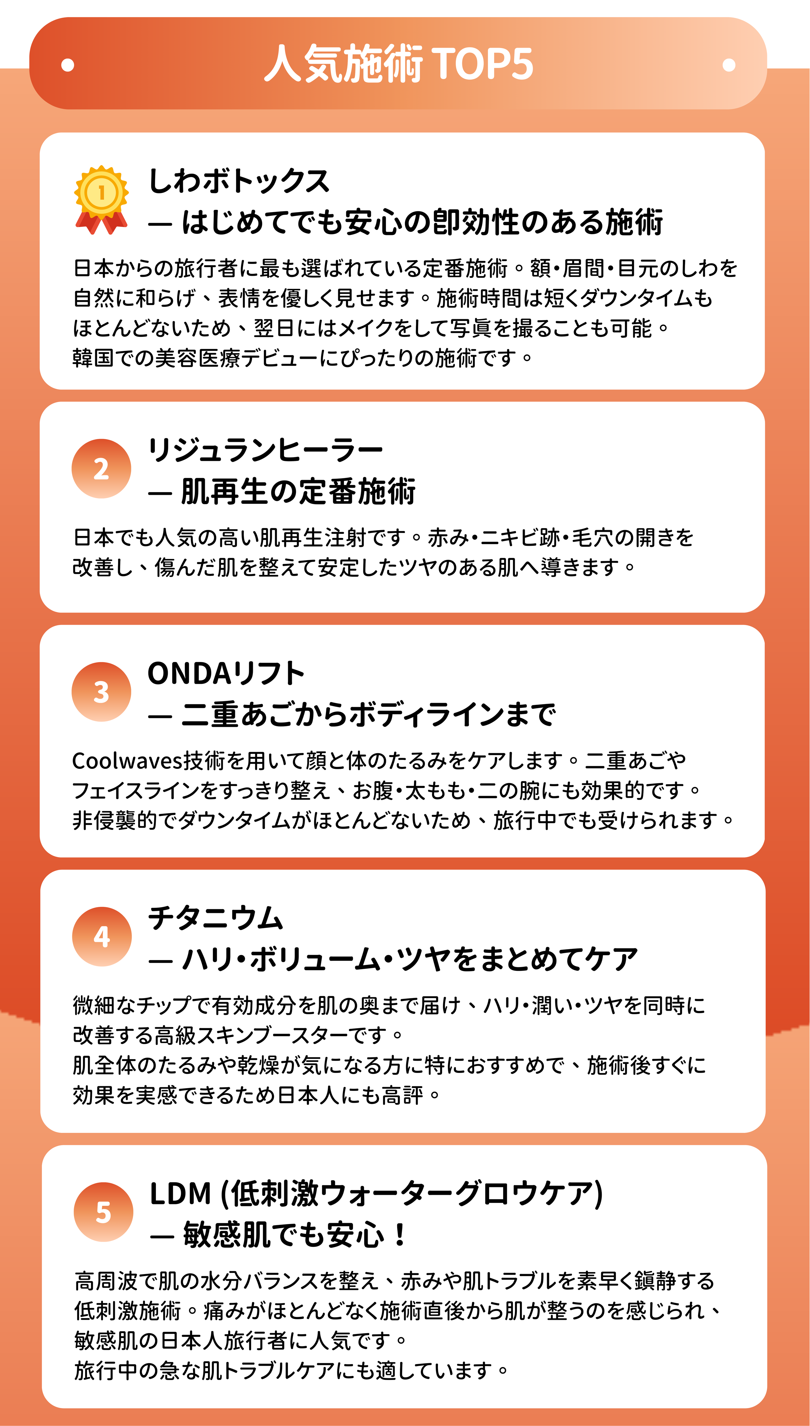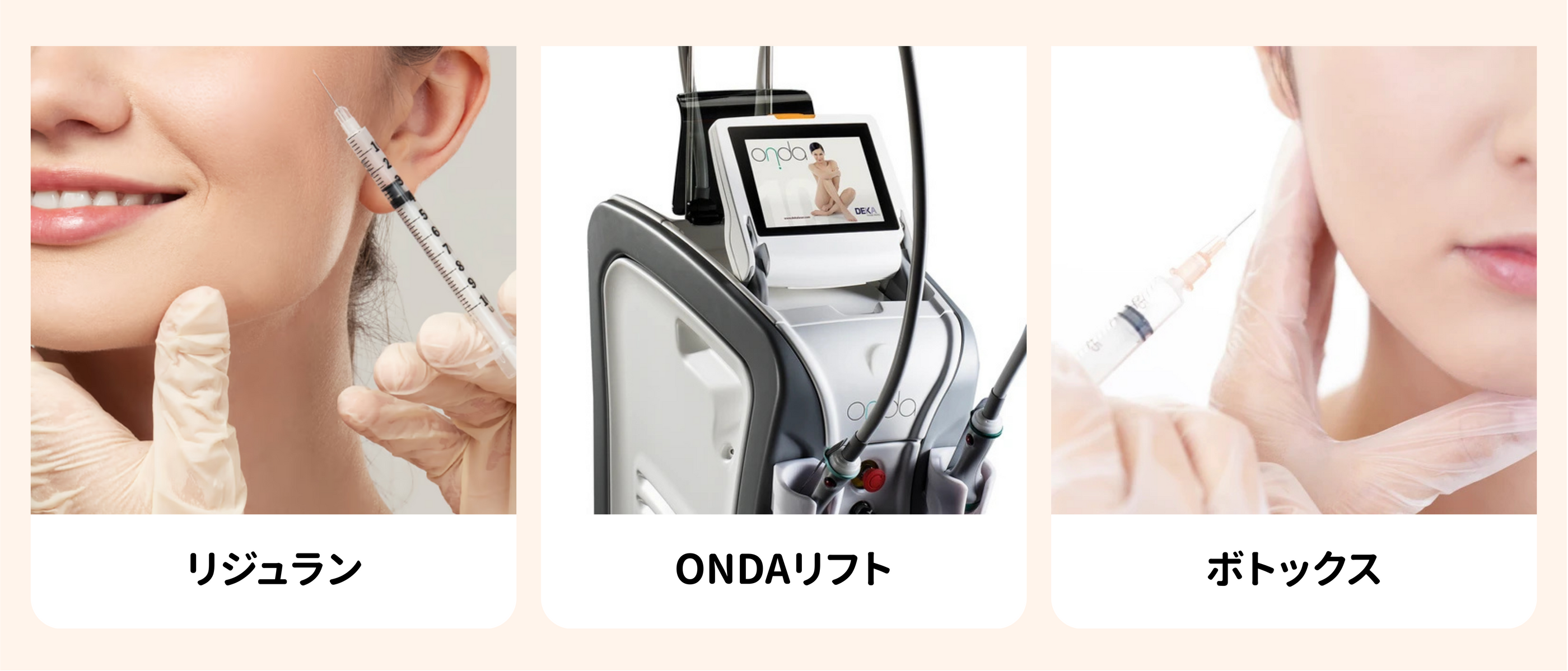 日本人に人気の即効性と自然な仕上がりを重視した施術を幅広く提供。しわボトックス、ジュベルック、ポテンツァ、ONDA、ソフウェーブなど、日本のSNSでも人気の施術を一か所で便利に受けられます。正規品・適量、不要な施術を勧めない透明なカウンセリングを徹底しています。