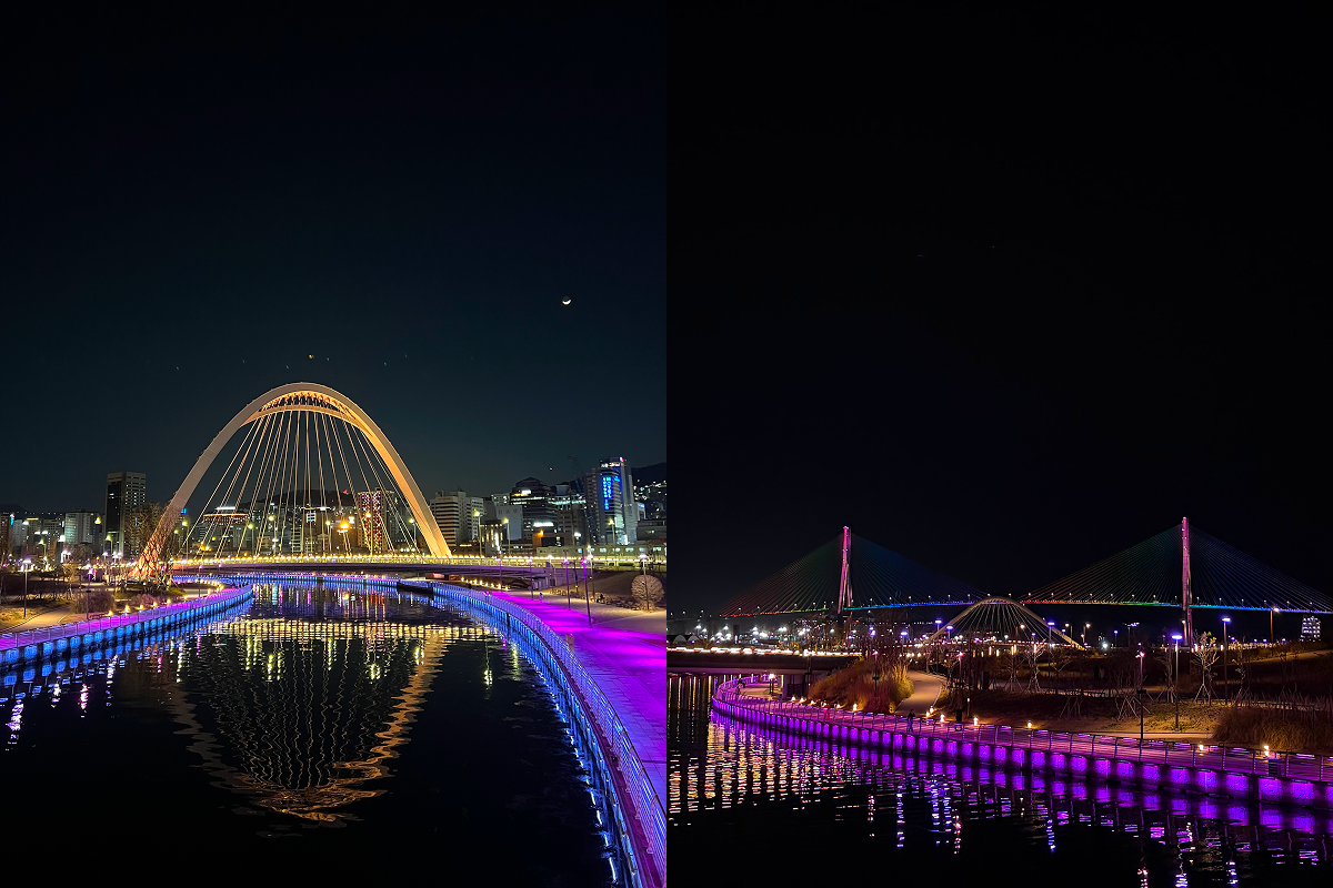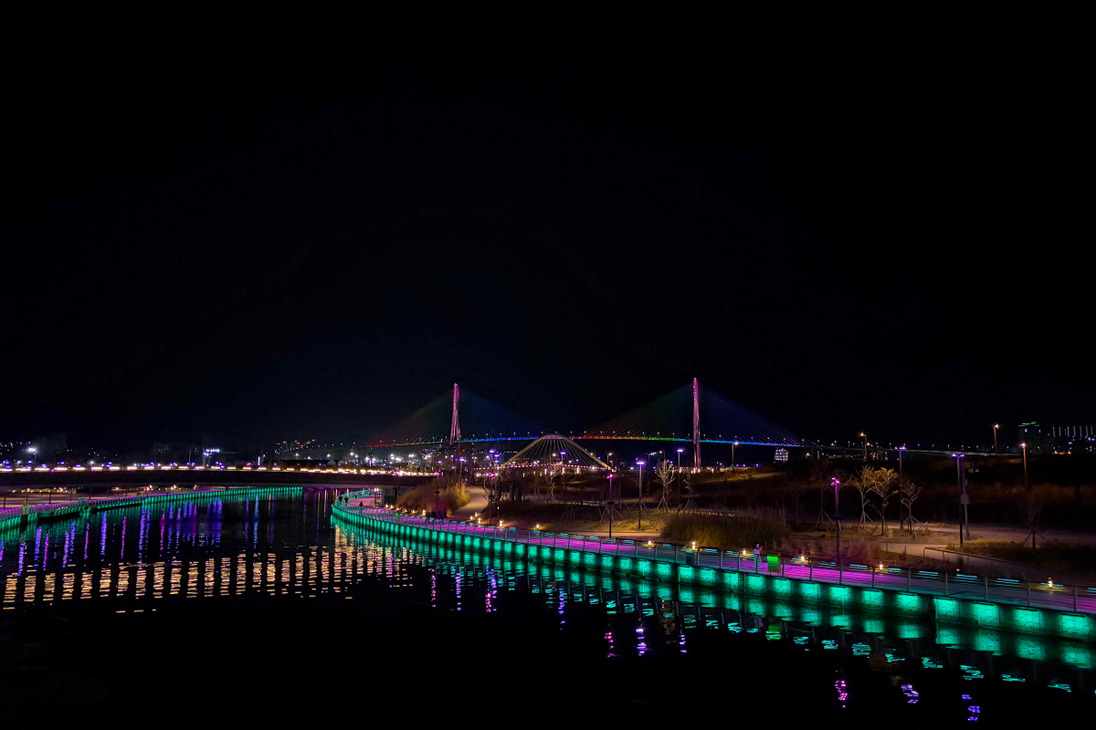 穏やかな水面に映る街の灯りと、ゆったりとした遊歩道が相まって、夜には一層完成度の高い景観を生み出します。