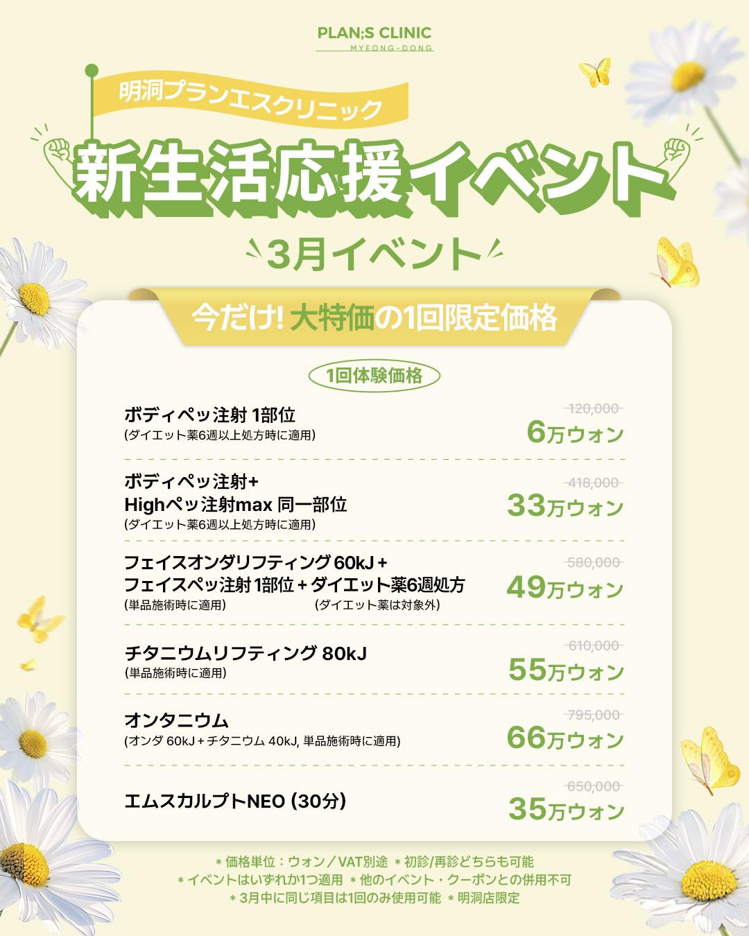 韓国美容をもっとお得に—人気施術を特別価格で体験するチャンス🤍今だけのCreatrip限定プラン、予約受付中!施術を決めていなくても相談無料予約で気軽に訪問可能&人気施術をお得に体験できるCreatrip限定パッケージ体型改善・ダイエット・リフティング専門クリニック独自開発「ペッ注射」で脂肪減少効果37%を立証チタニウムリフティング製造元「Alma社」公認他院よりお得な価格でチタニウムリフティングを提供室長との相談+院長との1:1個別カウンセリングで最適な施術プランを提案&施術後の状態に応じてリフティングやスキンブースターなどアフターケアを選べる効果が口コミで広がるダイエット薬の処方が人気江南駅すぐ&日本語対応スタッフ常駐で安心リジュオールクリーム20mlがもらえるレビュー特典付き公式インスタグラム(@plansclinic_official)3月限定イベント (※ 税別) 同行者イベントハッピーアワーイベント
