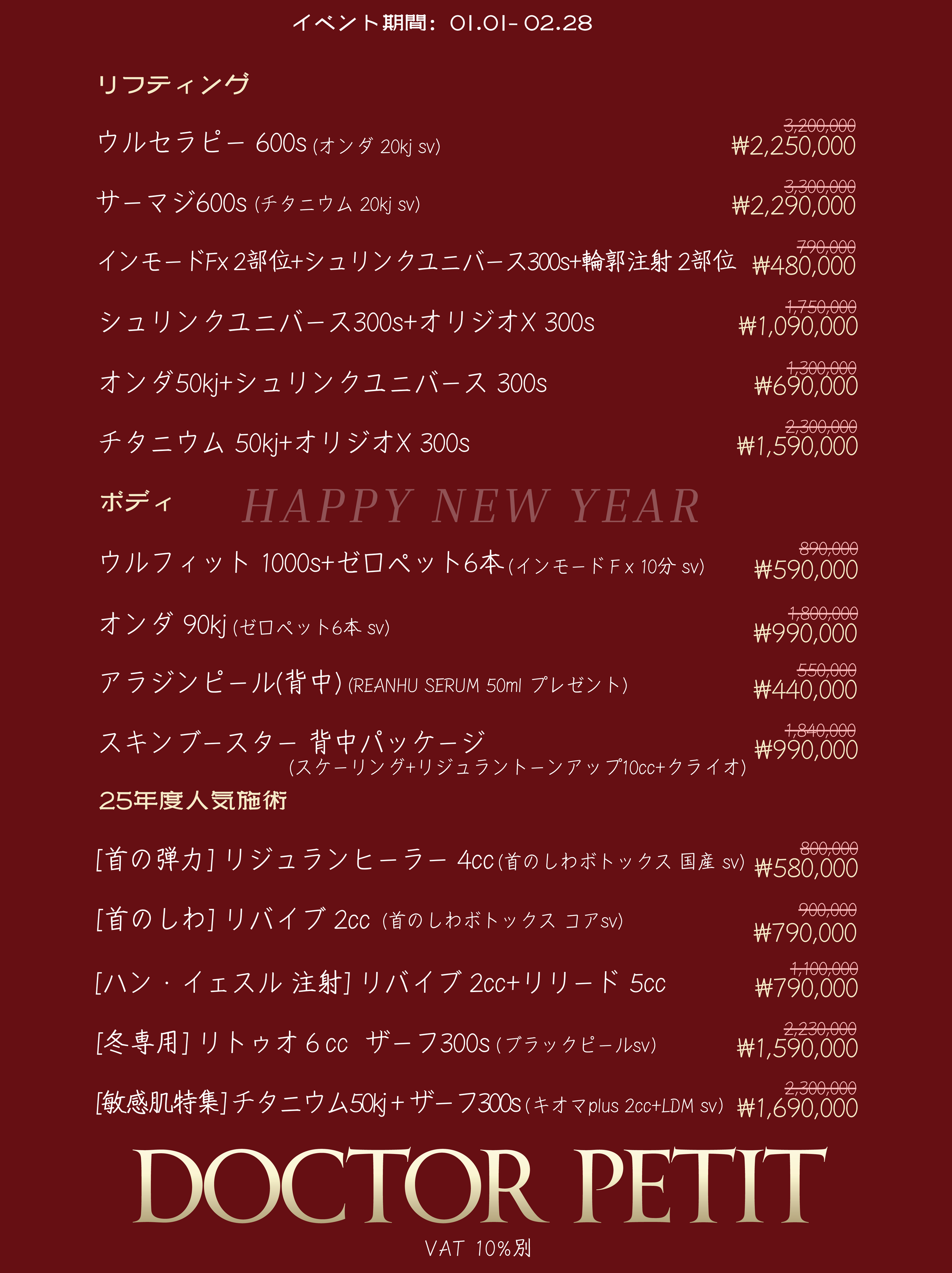 診療結果だけでなく来院から施術後までの快適さも重視の皮膚科2020年に新論峴で開院し、2024年に明洞の世宗ホテル2階に移転拡大明洞駅10番出口すぐ&日曜日も通常診療で週末利用にも対応ウルセラプライム・チタニウム・オンダ・サーマジFLX・ソフウェーブなど導入クレンジングから麻酔、施術、仕上げまでプライベートな個室で完結共用洗面台への移動やセルフクレンジングが不要で人目が気にならない肌状態や目的に合わせた丁寧な施術提案外国人患者の診療実績を活かした、安心できる診療環境ドクター紹介コ・ギョンドク 代表院長20年以上の皮膚科診療経験をもとに、肌・体型・レーザー施術全般にわたる深いノウハウを培ってきた皮膚科専門の施術院長です。ソウル峨山病院(韓国国内トップ、世界ランキング29位)で研修課程を修了し、さまざまな肌タイプや症例を直接経験してきました。一人ひとりの肌状態やライフスタイルに合わせた、精密で安定感のある施術を大切にしています。経歴現)ドクタープチ医院 明洞店 代表院長前)toxnfill 蘆原店 代表院長イベント料金表