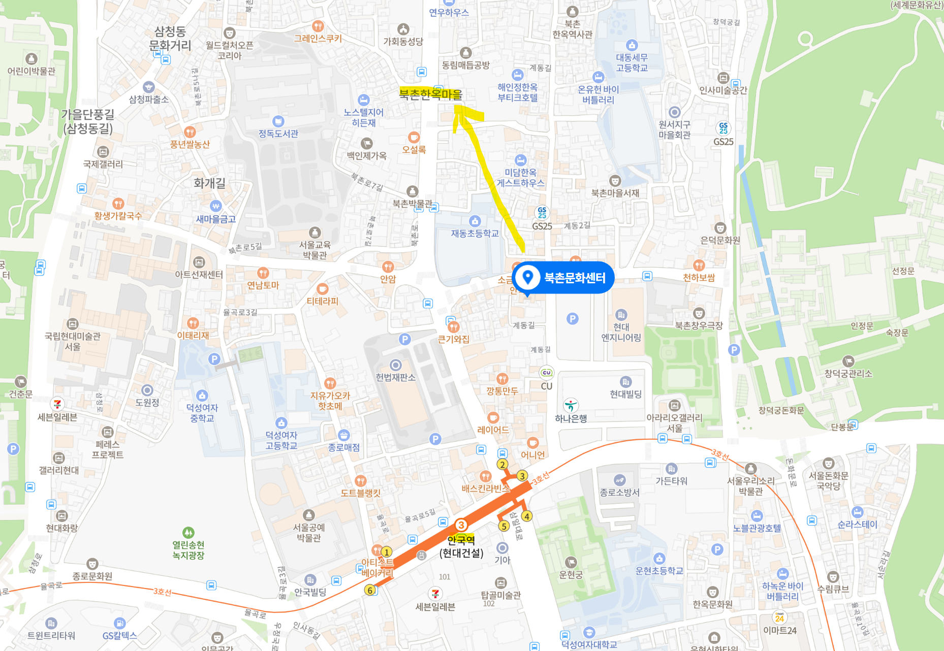 安国駅の2番出口を出て北村韓屋村方向にまっすぐ行ってください。