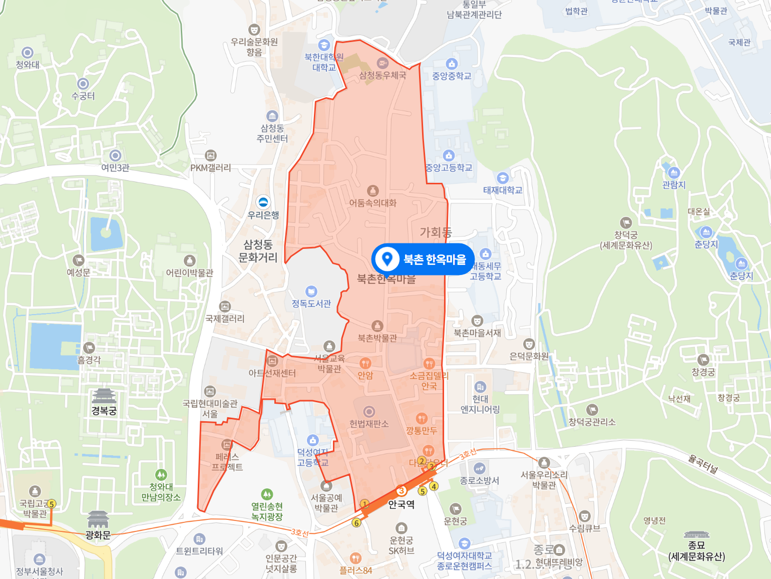 地図を見ると、安国駅の2番出口から北村洞のオフィステルが見えます。