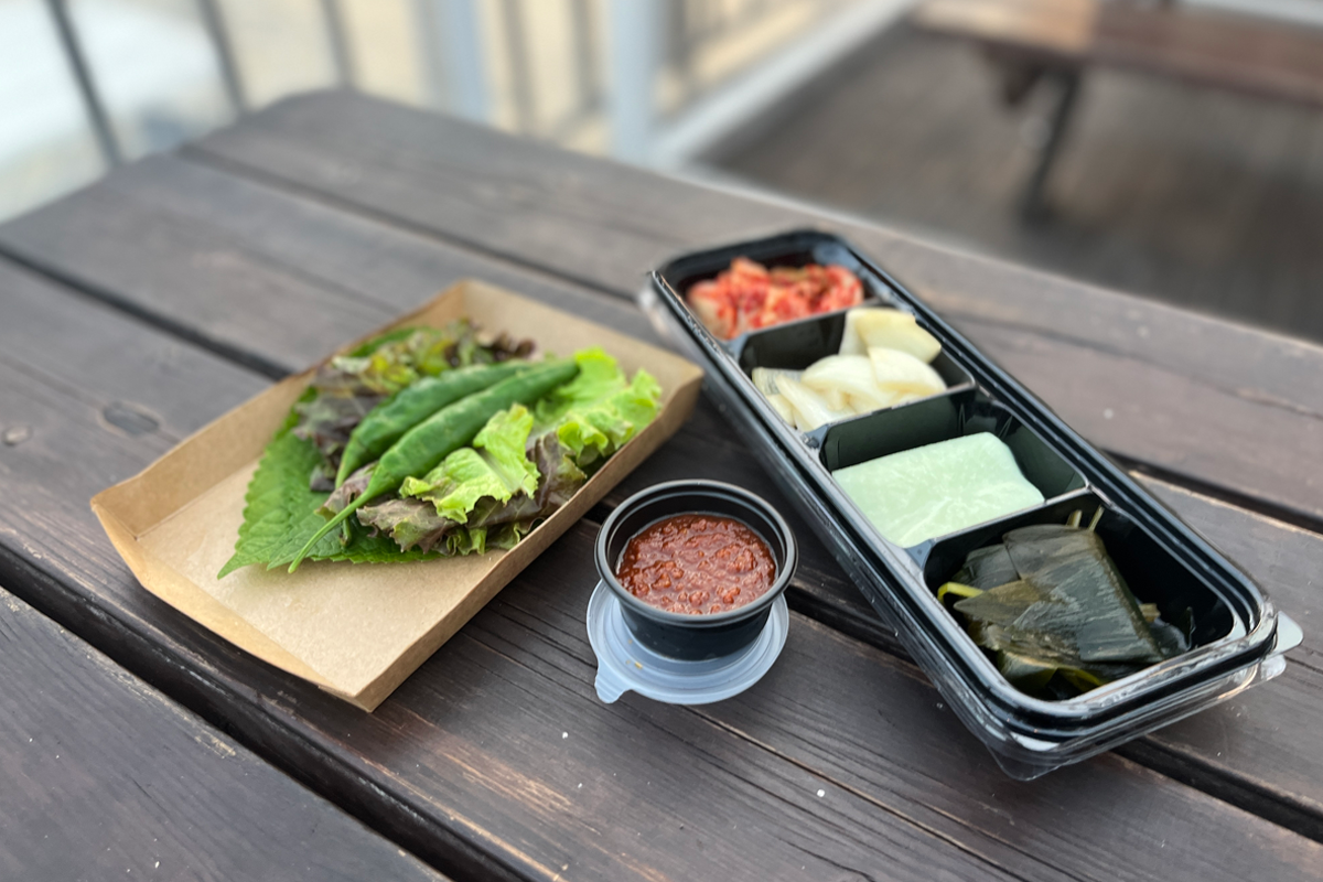 Салат навч, халуун чинжүү, перилла навч, ssamjang болон бусад хачирыг эхний давхарт хязгааргүй өөрөө үйлчлэх боломжтой.