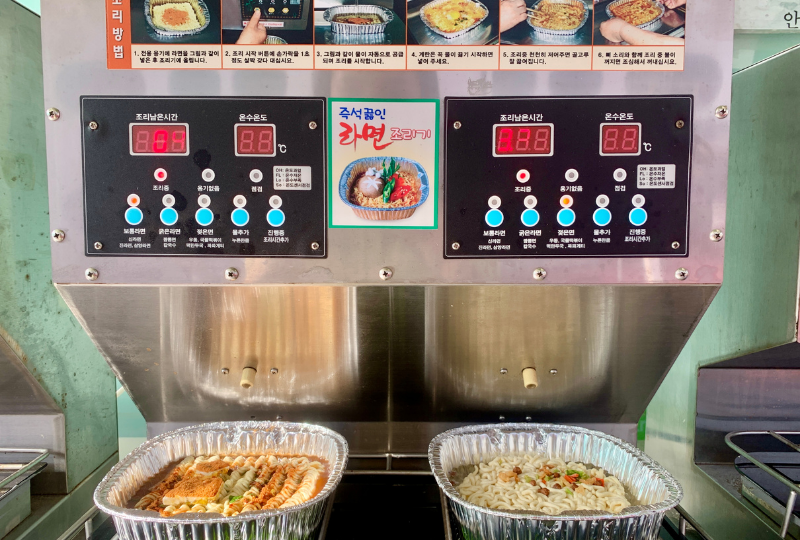 Бүх дэлгүүрт дээрх шиг рамен хоолой байдаг бөгөөд, Хан мөрний дагуух цэцэрлэгт хүрээлэнгийн дэлгүүрүүдээс рамен худалдан авахад танд жижиг таваг, савх өгдөг тул та түүнийг шууд идэх боломжтой. Та худалдан авсан раменийн төрлийг тааруулан товчлуур дарах замаар эдгээр рамен хоолойг ашиглаж болно. Машин усны зөв хэмжээг мэдэж, таны раменийг зөв хугацаанд чанана.