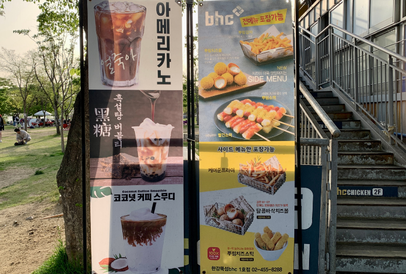 Хүргэлт нь солонгосчуудад цэцэрлэгт хүрээлэнд хоол идэх хамгийн стандарт арга байх магадлалтай ч, хүргэлт захиалахын төвөгтэй байдлыг хүсэхгүй байгаа жуулчдад зориулсан тав тухтай дэлгүүрүүд бий. Ттүксом Хан мөрний цэцэрлэгт хүрээлэнд 3 GS25 дэлгүүр, мөн Ханган Ариран дахь Хан мөрөн дээр байрлах 7-Eleven дэлгүүрт зууш, хоол авч болно!