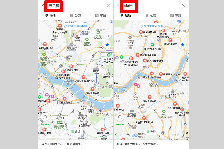 Хэрэв таны байгаа газарт эсвэл зочид буудлын ойролцоо EMart байгаа эсэхийг шалгахыг хүсвэл Naver Map аппыг ашиглаж болно. Англиар 'emart' эсвэл Солонгосоор '이마트' гэж хайгаад ойр байгаа Emart байршлыг олж болно.