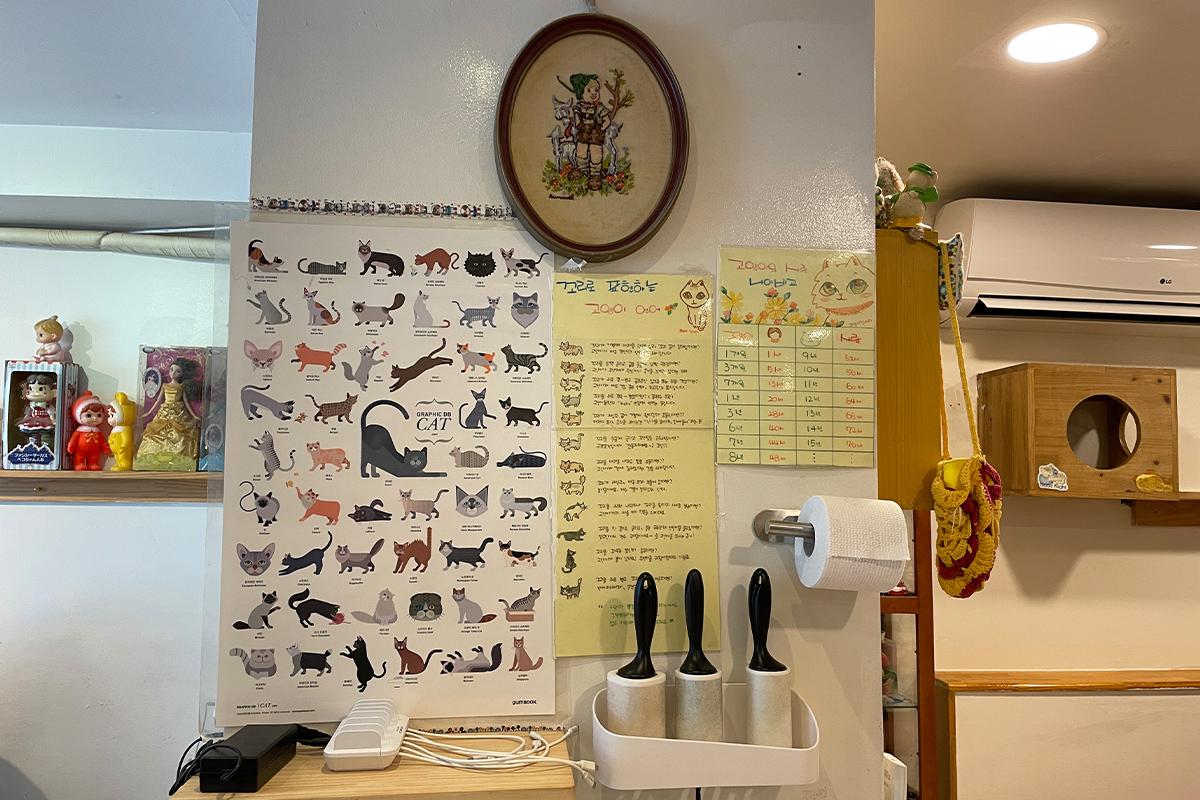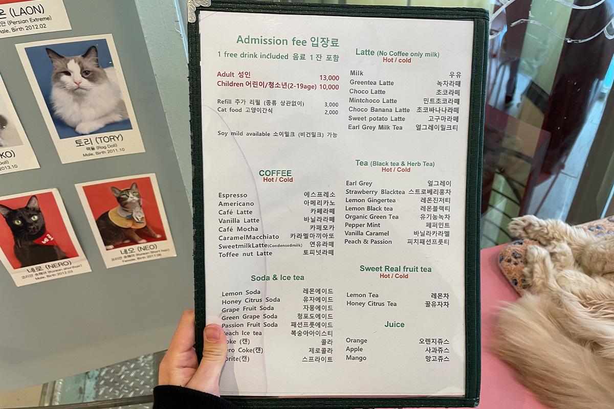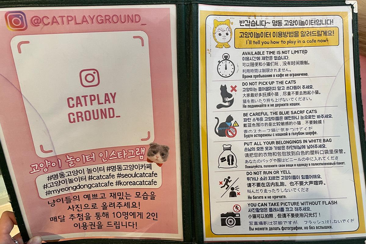 Урьдчилан сэргийлэх удирдамжуудыг самбар дээр Солонгос, Хятад, Япон, Англи, Орос хэлээр бичсэн байна. Ундааны цэсийг Англи хэлээр бичсэн байна. Муурнуудыг биширч эхлэхээс өмнө урьдчилан сэргийлэх удирдамжуудыг уншаарай!