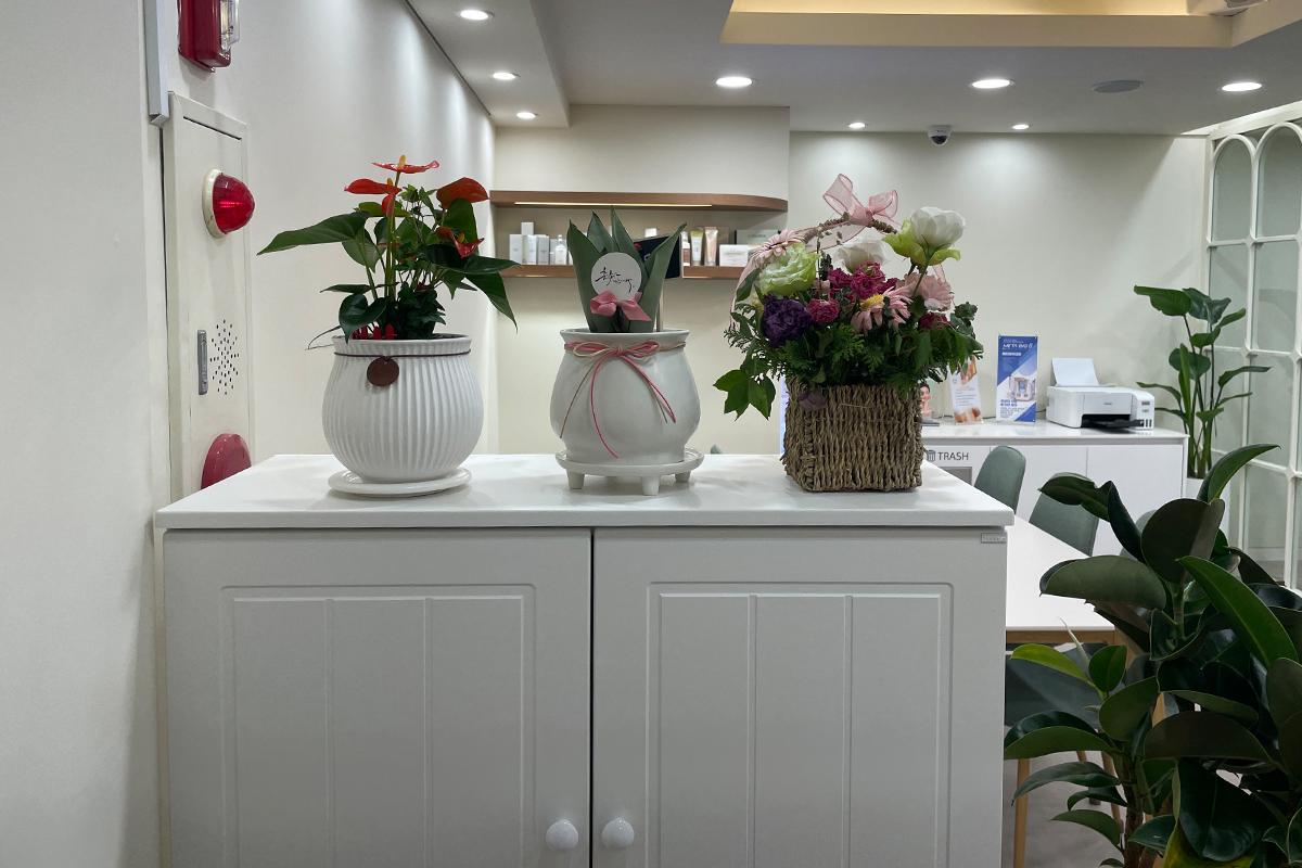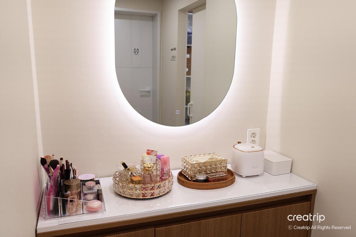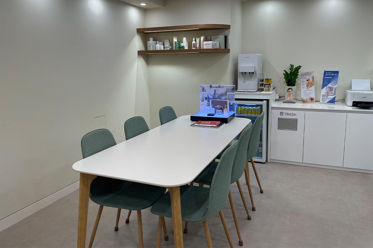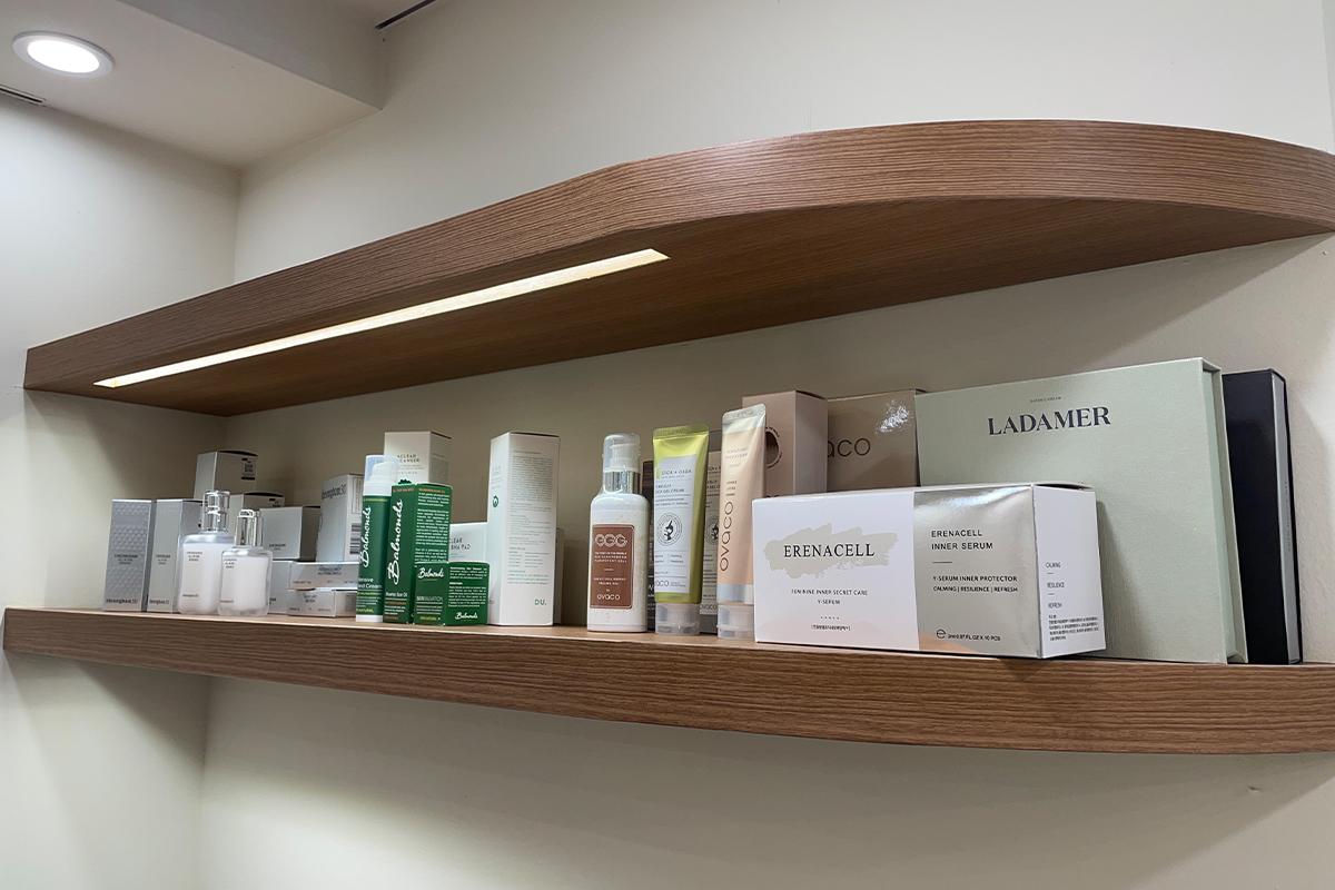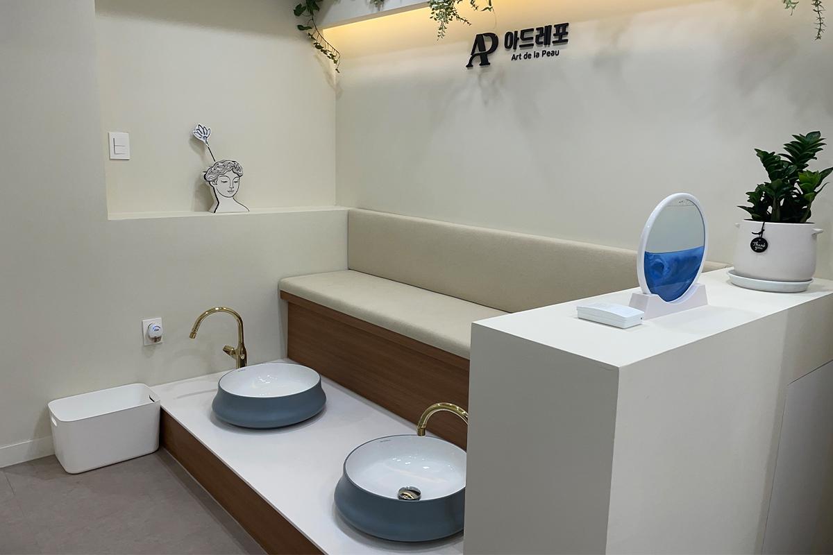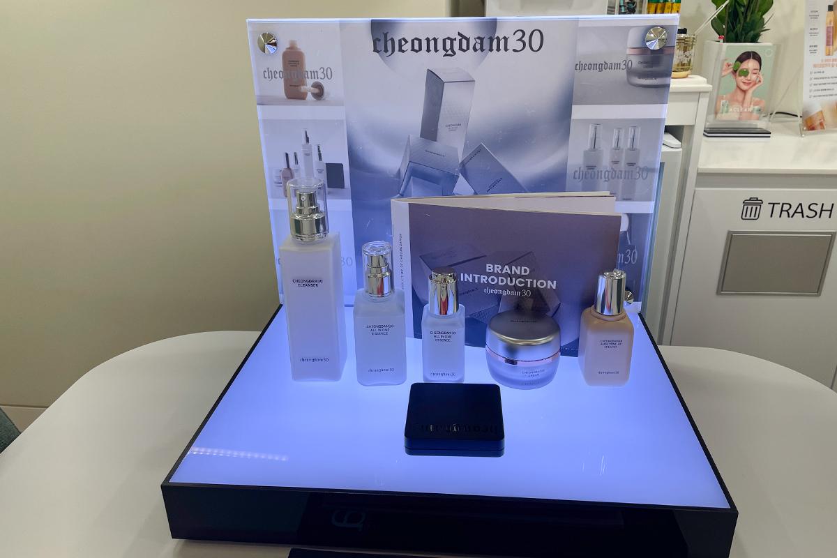 Хүлээж байхдаа та төрөл бүрийн гоо сайхны бүтээгдэхүүнийг үзэж болно. Ширээн дээр, Studio The Third Mind-ын нүүр будалтын мэргэжилтэн Виктория Ан-гийн бүтээсэн гоо сайхны брэнд Cheongdam 30 бий. Тэрээр алдартнуудын нүүр будалтын үед эдгээр бүтээгдэхүүнийг ашигладаг.Нэмж хэлэхэд, тавцан дээр Y-zone-ыг арчлах зорилготой ERENACELL нэртэй дотоод серам байдаг.