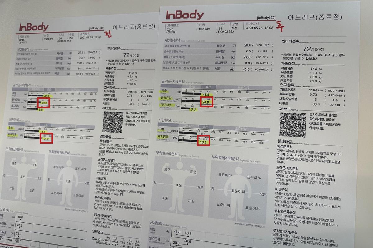 Зүүн талд 'Урьд' хэмжилт, баруун талд 'Дараа' хэмжилт байна. Жинэнд томоохон өөрчлөлт гараагүй боловч редакторын ясны булчингийн массыг 0.8кг-ээр нэмэгдсэн, биеийн өөхний хувь нь 18.4%-д багассан.Энэ нөлөөг олж авахад заавал туршиж үзэхээс төрөлжсөн зүйл байна!