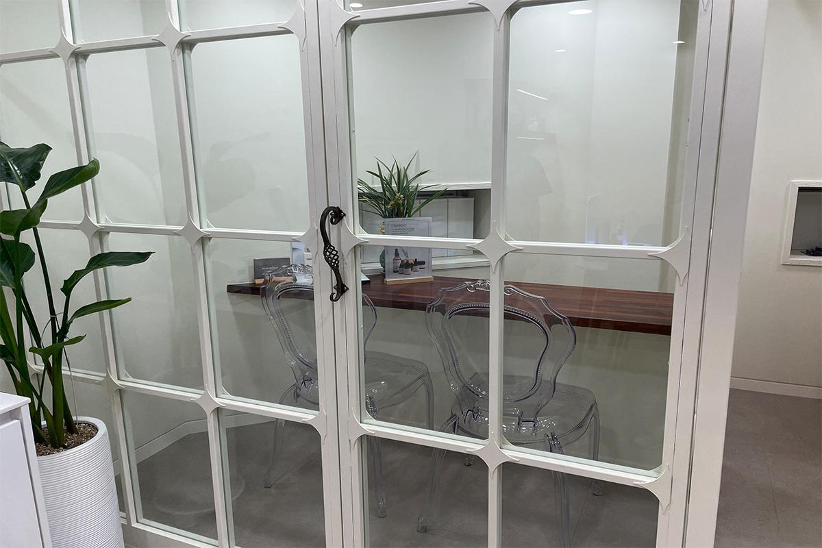 Дэлгүүний зүүн дээд хэсэгт зөвлөлдөх зориулалттай тусгайлсан хэсэг байдаг. Шилэн хаалга болон сандал нь тунгалаг байдлыг мэдрүүлж, Art de la peau-ийн тунгалаг үнэ болон асрамжийг симболиздож байна.