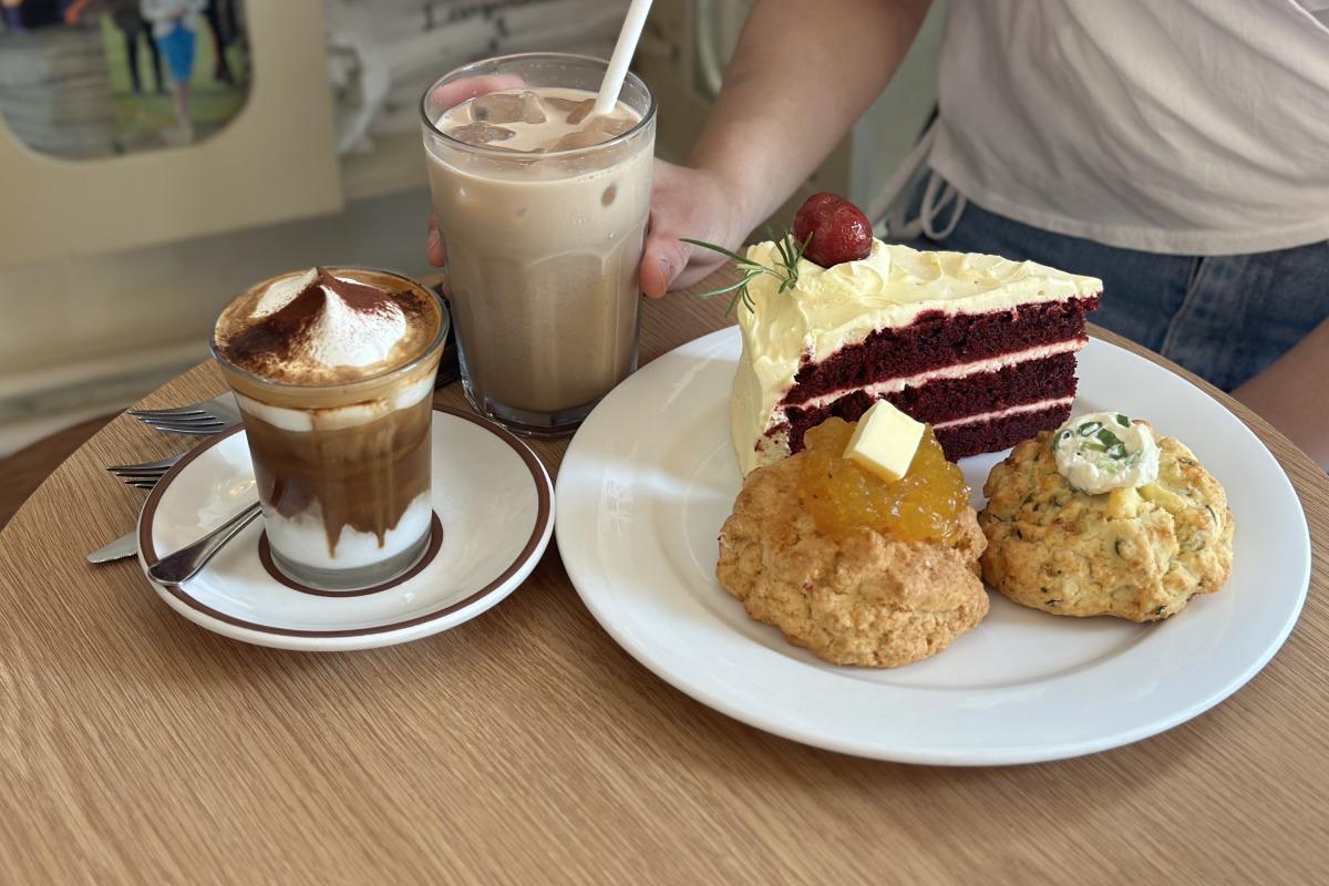 Бид Ногоон Сонгины Ногоон Крем Скон (5,800 KRW) болон Улаан Хилэн Крем Санд Кэйк (8,500 KRW) авахаар шийдсэн. Ундааны хувьд бид тэдний гарын үсэг болсон цай, Сүүтэй Цай (7,500 KRW) болон Мөстэй Эйншпаннер (6,500 KRW) авсан.