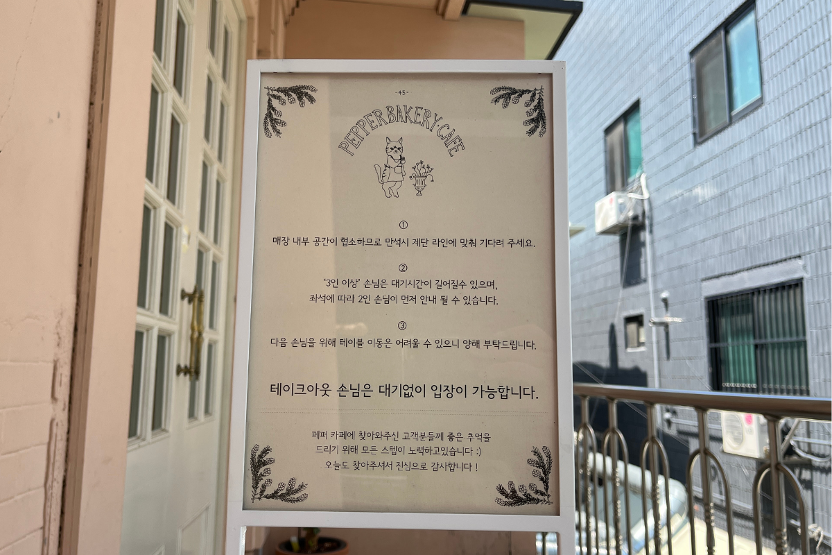 Энэ кафе маш их хүнтэй болдог гэж сонссон учраас 11 цагт онгоймогц очсон. Аз болоход дараалал байгаагүй ч орох хаалганы өмнө дараалал үүсгэх тухай хэд хэдэн мэдээллийн самбар байлаа.