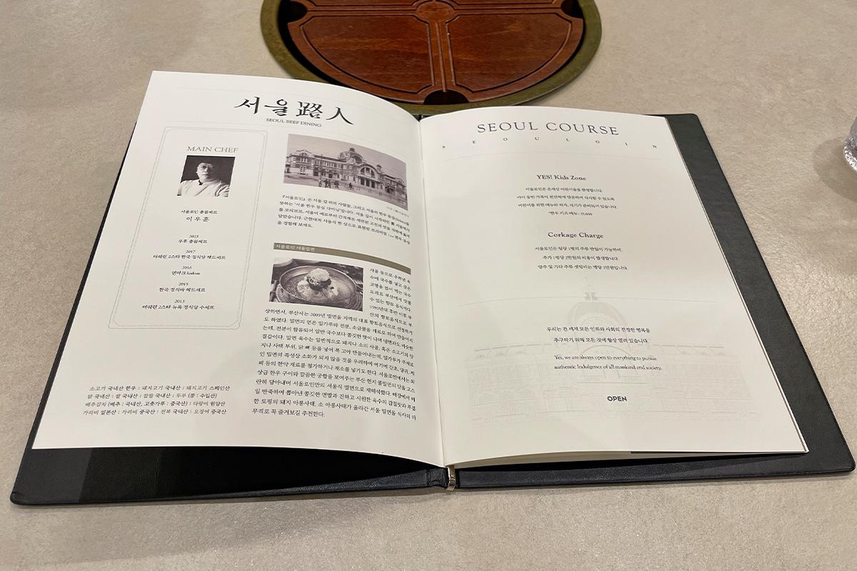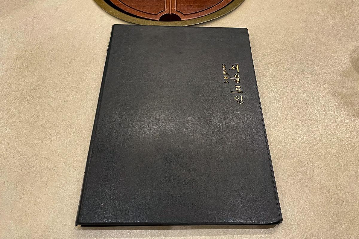 Өнөөдөр бид Dinner Signature Couple Course-г оролцохоор төлөвлөж байна. Цэсийг хүлээх зуур миний анхаарал цэсний самбар руу чиглэв. Түүний хар өнгийн палет нь уламжлалт орчныг орчин үеийн, хөгжилтэй мэдрэмжээр нэмэгдүүлж байна. Дотор нь Seoul Line тухай бичигдсэн сонирхолтой түүх уншихад их сонирхолтой байлаа.