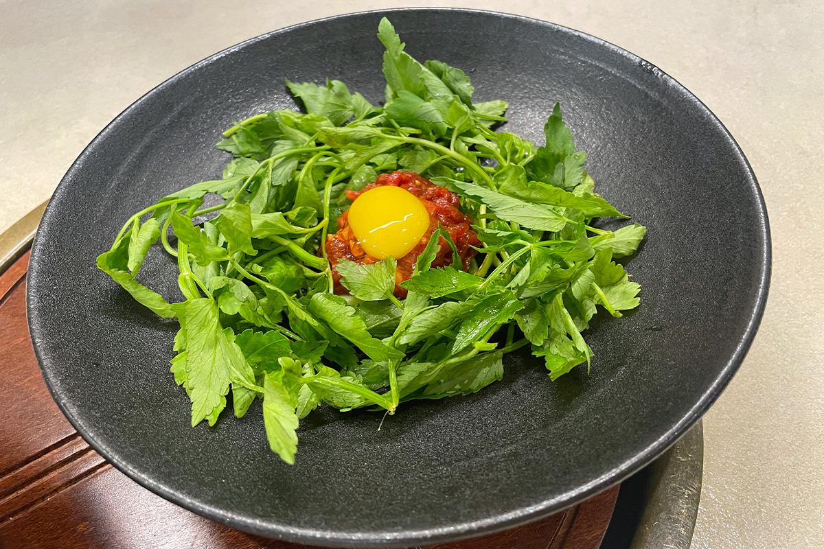 Оройн зоог эмэгтэй хоёр хүнтэй хоолны сонголтоос Yukhoe болон Yukjeon-ийн хооронд сонгох боломжийг олгодог тул бид хоёр тус бүр нэгийг сонголоо. Yukhoe нь гочужанганд хийсэн амтлагчтай бөгөөд минаритай хамтирдаг бөгөөд минари нь yukhoe-ийн баялаг бөгөөд өндөгний шарыг давхарлан нийлүүлж, тааламжтай холимогийг бүрдүүлдэг.