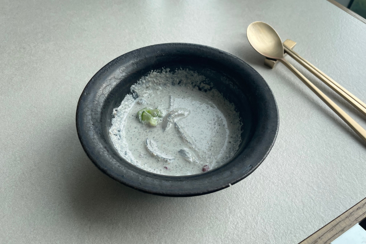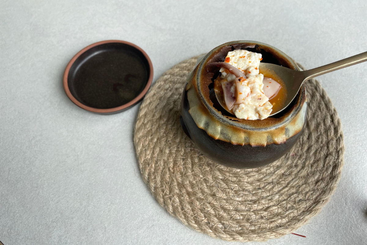 Гурав дахь хоолыг дуусгасны дараа бидэнд далайн хүнстэй зөөлөн тофу шөл ирсэн бөгөөд энэ нь өхөөрдөм саванд ирсэн. Та үүнийг халбагаар дээрх төмсний давхаргыг хагалаад идэж болно. Би төмсний шаржигнуур давхаргыг болгоомжтой хагалж, энэ нь үнэндээ шөлтэй маш сайн зохицож байлаа.